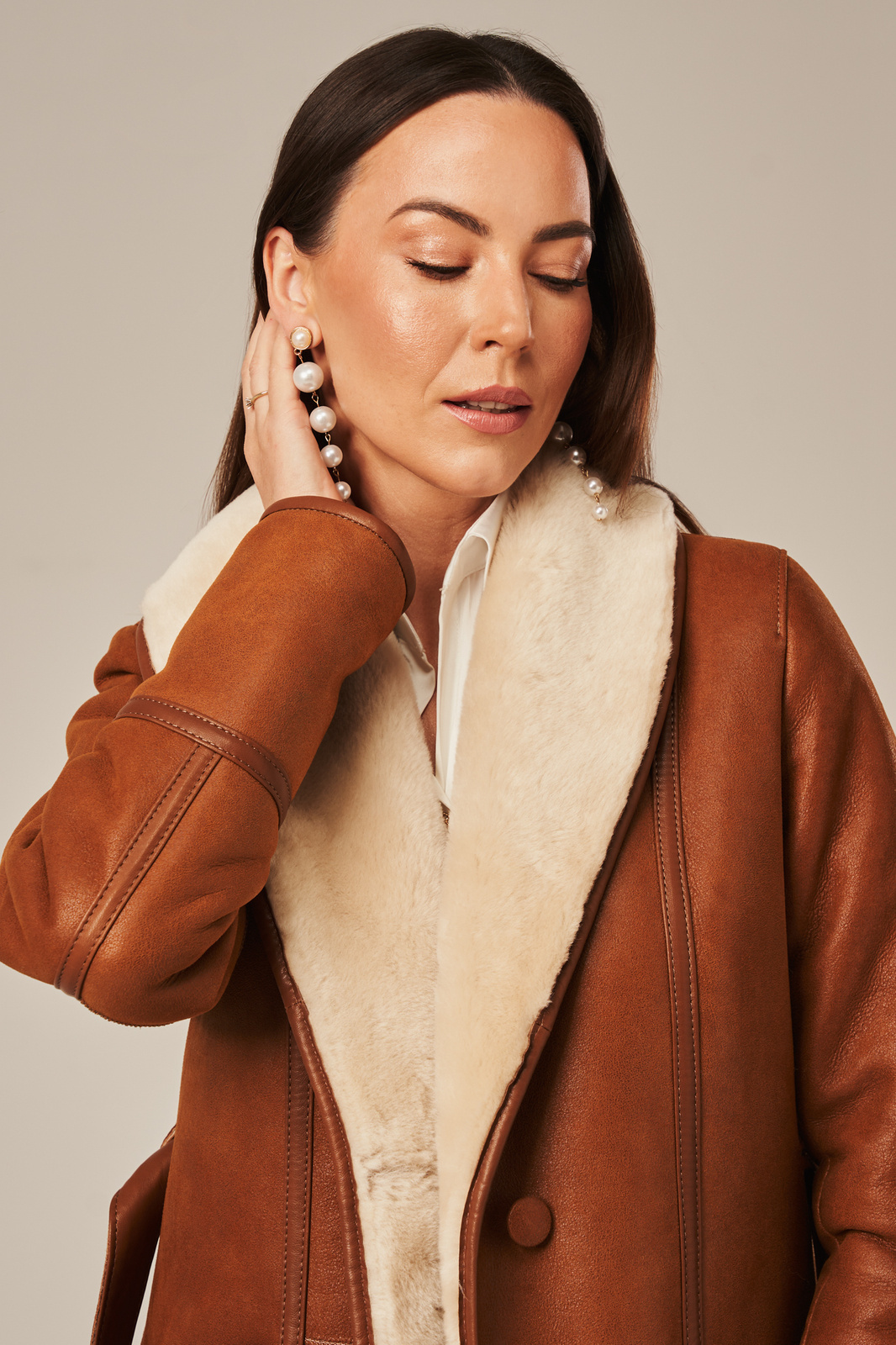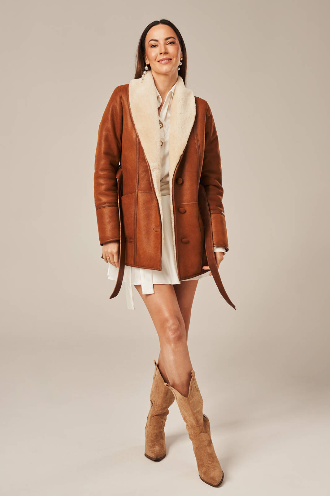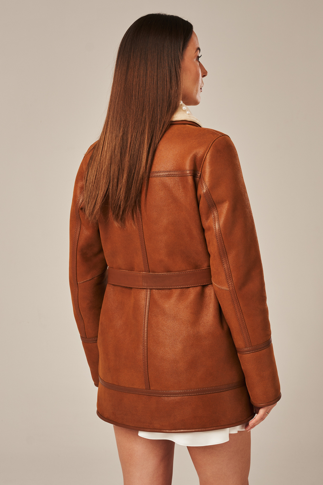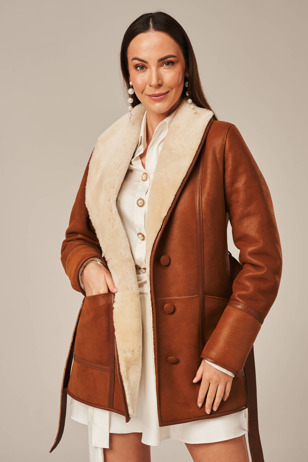 Moteriška avikailio striukė – natūralus žieminis paltas moterims. Ši moteriška avikailio striukė pagaminta iš lengvos ir minkštos natūralios ėriuko odos rudos spalvos atspalvių su šviesiu kailiu. Natūralus avikaili paltas užtikrina šilumą net šalčiausiomis žiemos dienomis. Viduje esantis tikras ėriuko kailis palaiko komfortišką kūno temperatūrą. Avikailio striukė turi dvi įleistines kišenes ir juosiamą juostą juosmens srityje, užsegamą sagomis, kad būtų patogu ir galima reguliuoti. Kraštai apdailinti tamsesnės spalvos oda, suteikiančia elegantiškumo ir išskirtinumo. Šis natūralus avikailio paltas puikiai tinka kasdieniams deriniams – dera su džinsais, šiltais megztiniais ir yra populiarus pasirinkimas moterims Lietuvoje. Taip pat striukė puikiai dera ir elegantiškoms progoms, kai ją derinate su suknelėmis ir aulinukais. Rinkitės šią moterišką avikailio striukę – tobulas derinys natūralios šilumos ir klasikinio stiliaus žiemai!