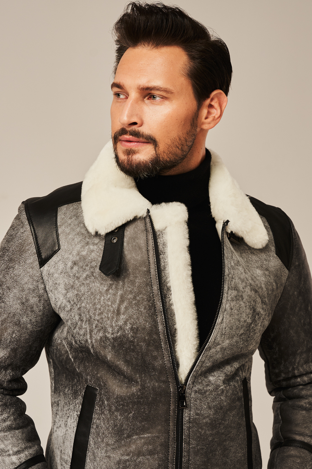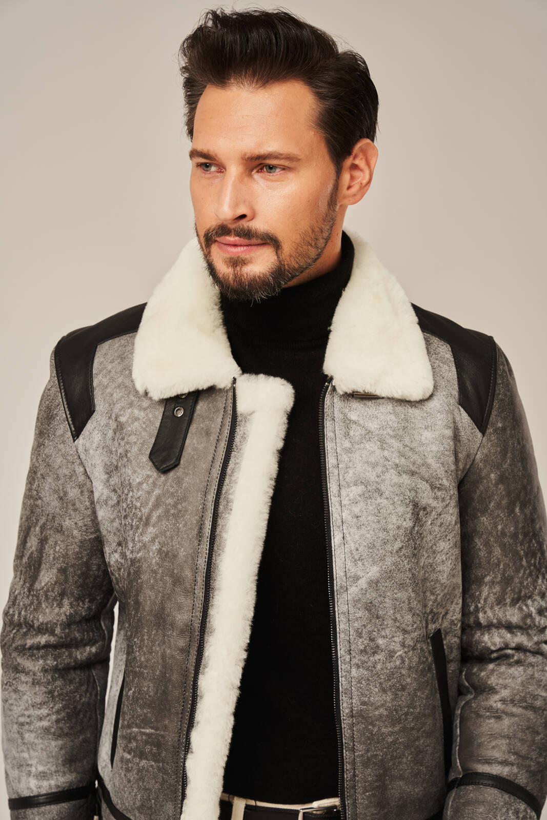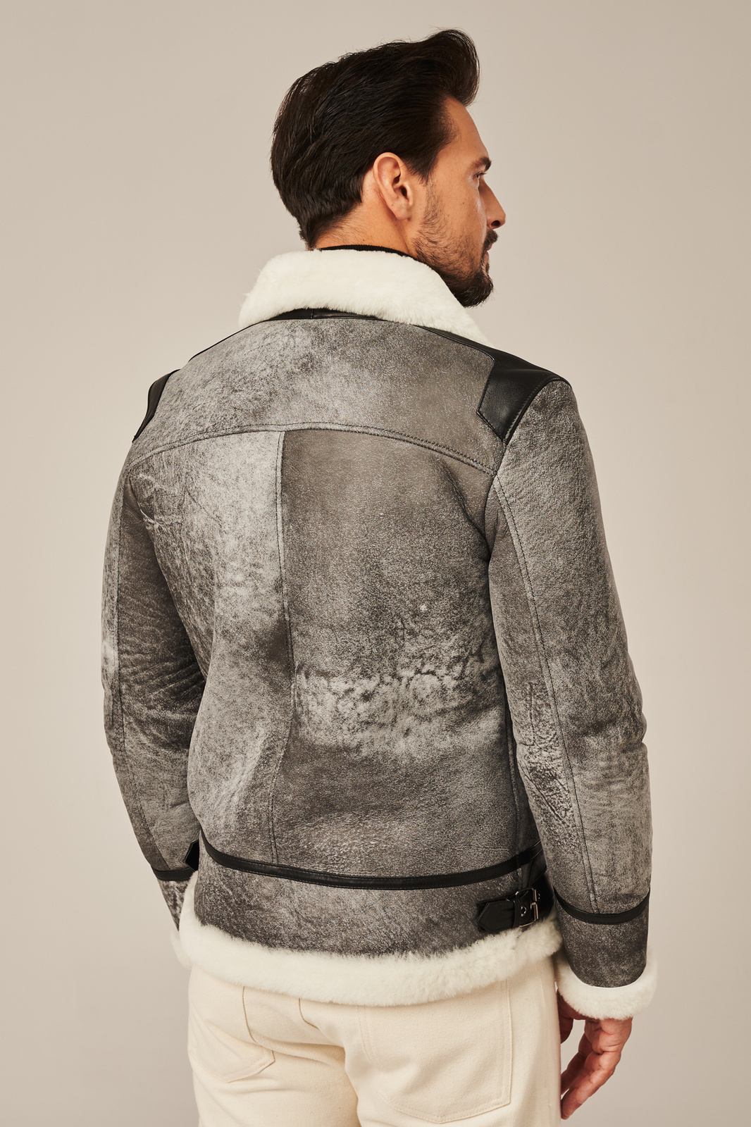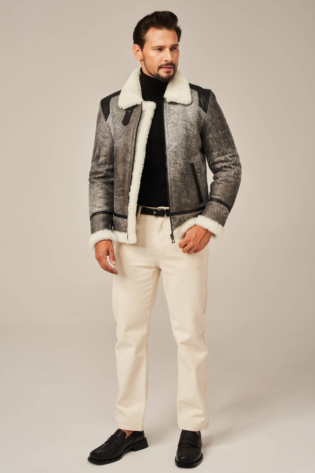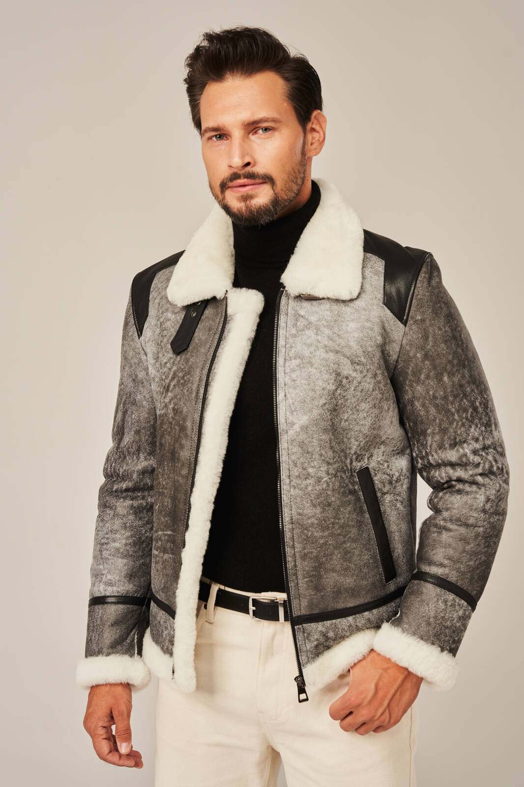 Pilka vyriška žieminė striukė iš natūralios avikailio odos – aviatoriaus stiliaus su natūraliu kailiu. Ši pilka vyriška žieminė striukė iš natūralios avikailio odos puikiai derina klasikinį aviatoriaus stilių, šiuolaikinį dizainą ir neprilygstamą šilumą. Pagaminta iš aukščiausios kokybės natūralios ėriuko odos, ši vyriška odinė striukė žiemai išsiskiria išskirtiniu lengvumu, minkštumu ir ilgaamžiškumu. Vidus išklotas balto ėriuko kailio, kuris natūraliai reguliuoja kūno temperatūrą net šalčiausiomis žiemos dienomis. Stilingas modelis su masyviu apykakle gali būti dėvimas pakeltu stovu, kad geriau apsaugotų nuo vėjo ir šalčio. Priekyje – tvirtas metalinis užtrauktukas ir dvi patogios kišenės, nepastebimai įsiūtos šonuose. Striukės kraštai ir apdailos detalės pagamintos iš lygios juodos natūralios odos, suteikiančios subtilaus kontrasto ir vyriško charakterio. Ši vyriška žieminė aviatoriaus striukė iš natūralios odos ne tik atrodo prabangiai, bet ir yra ypač funkcionali. Dėl universalaus pilko atspalvio ją lengva derinti su džinsais, vilnoniais megztiniais ar masyviais žieminiais batais. Tai – puikus pasirinkimas miesto stiliaus gerbėjui, ieškančiam kokybiško ir šilto sprendimo žiemai.