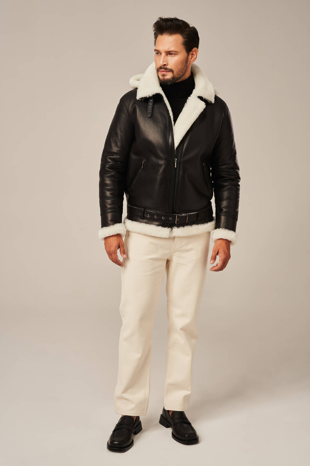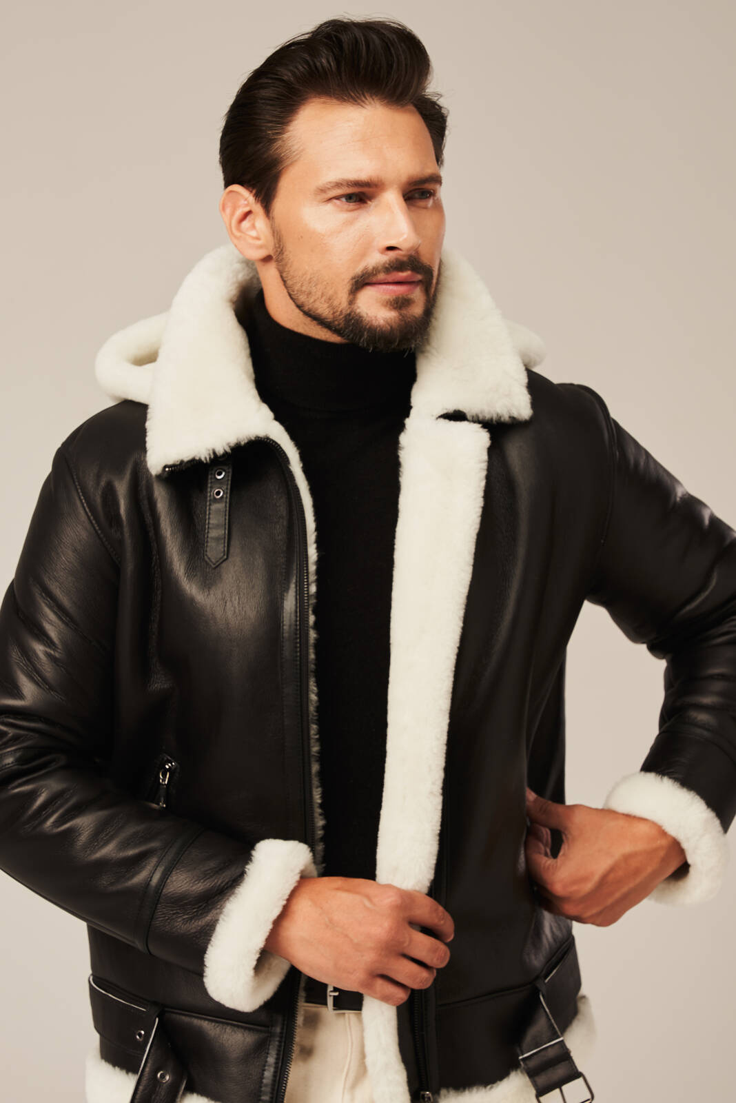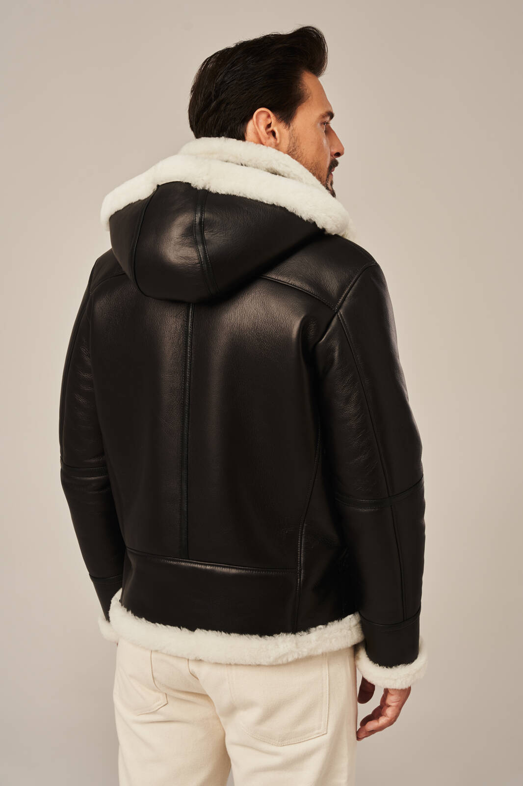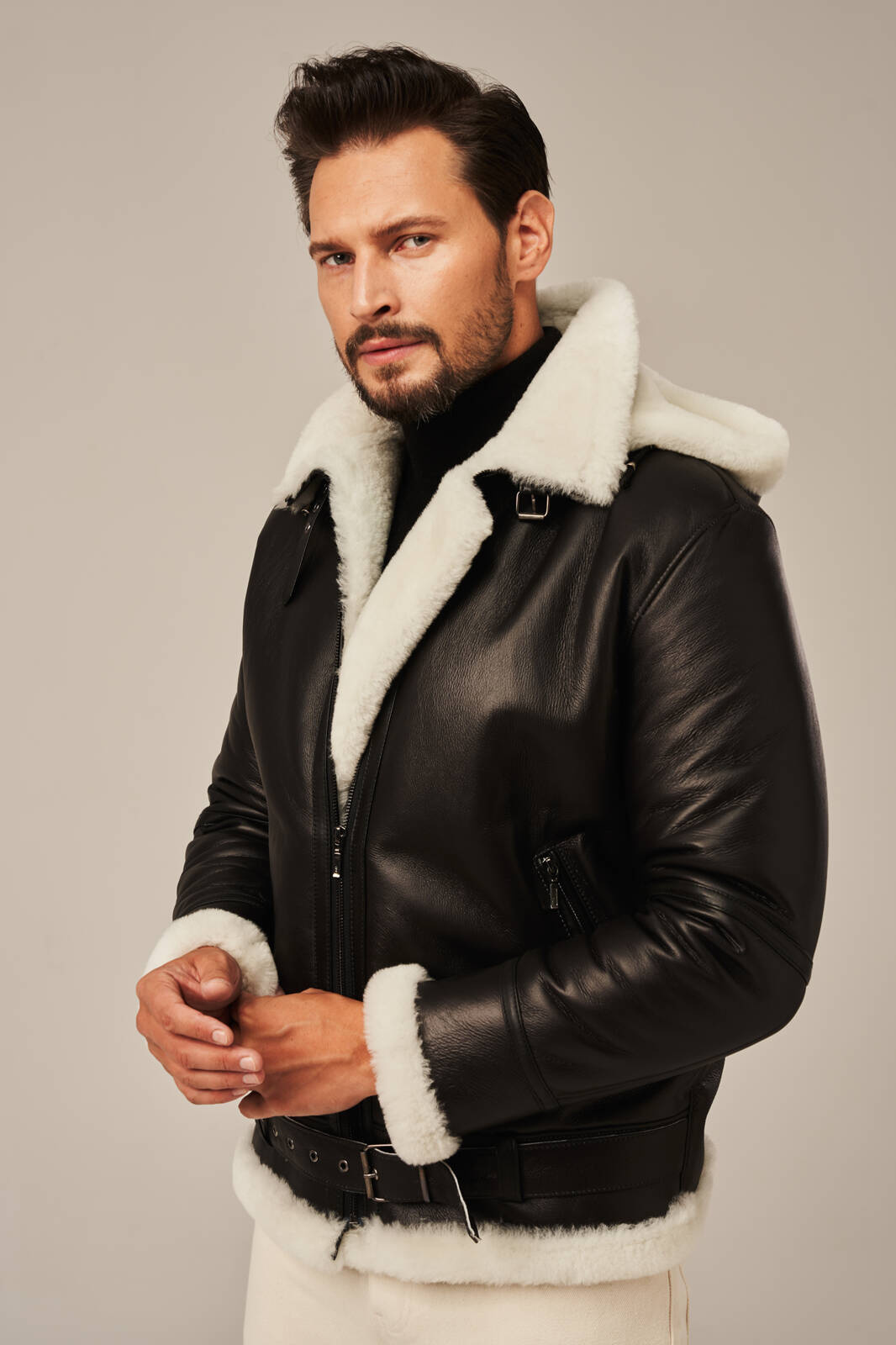 Vyriškas žieminis avikailio paltas su gobtuvu – juodos spalvos
