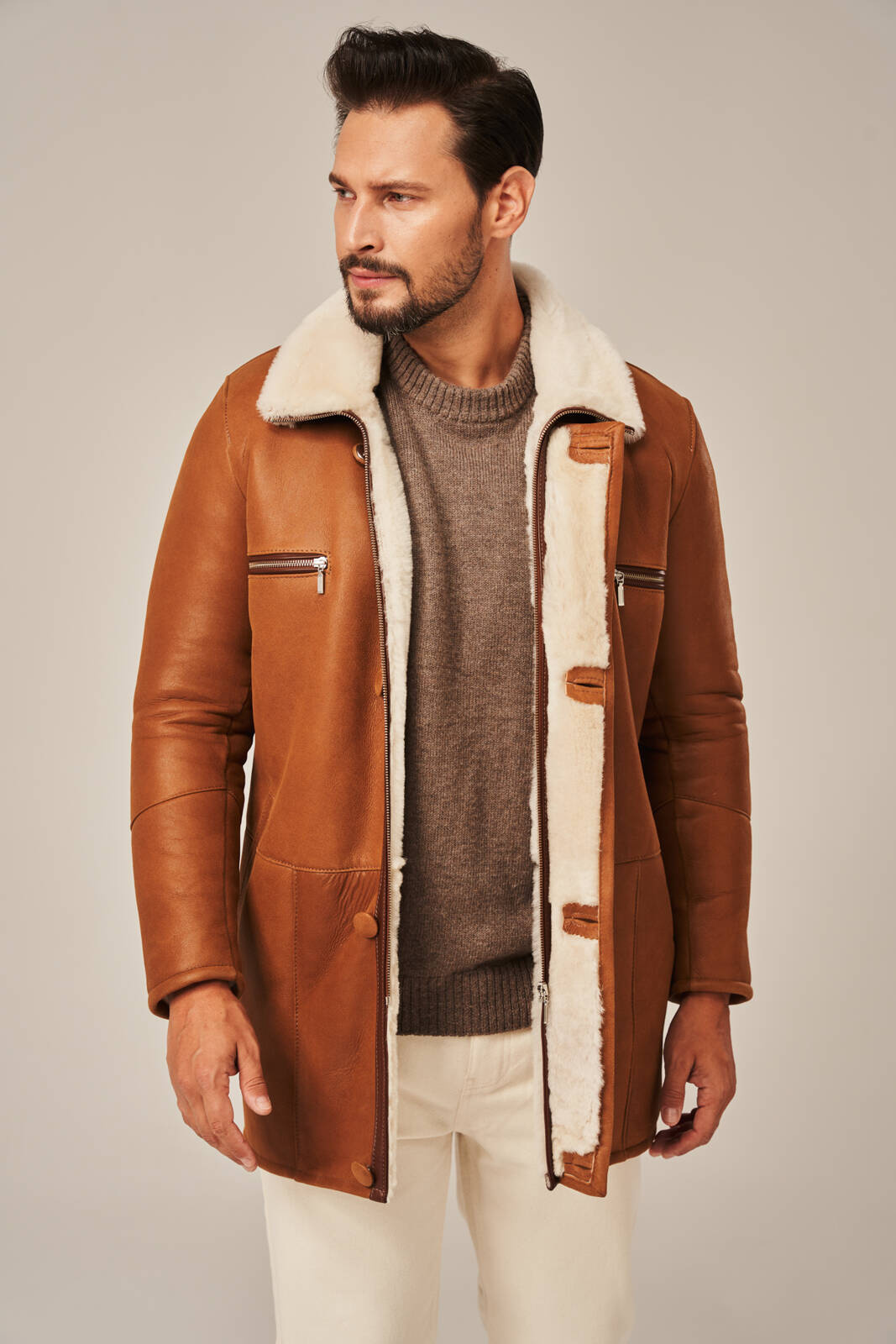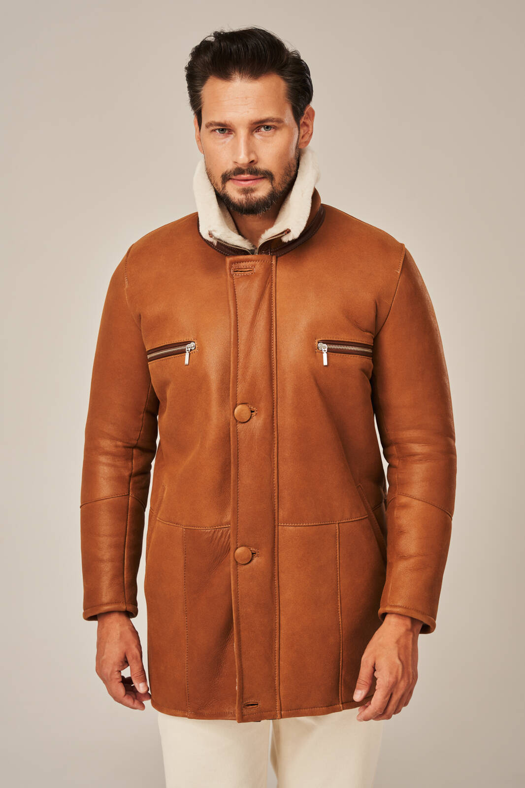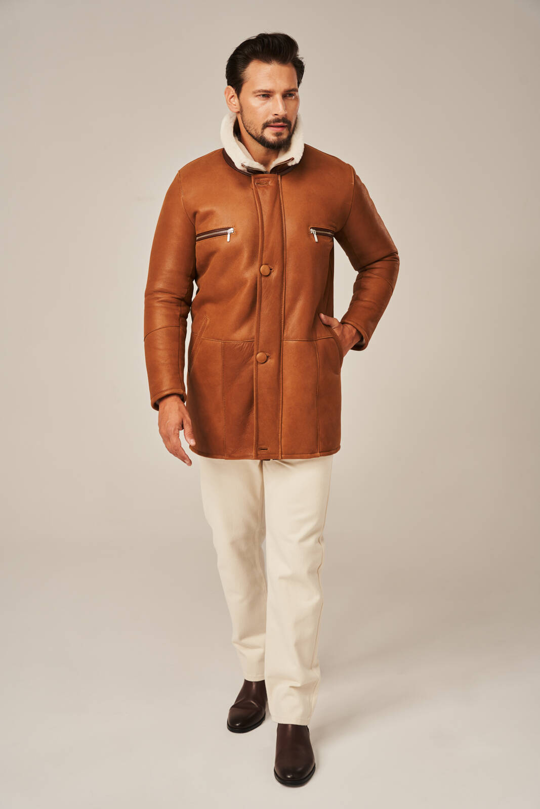 Ilgas vyriškas avikailio paltas žiemai – rudos spalvos, iš natūralios odos su avikailio kailiu. Stilingas ir šiltas ilgas vyriškas avikailio paltas, pagamintas iš impregnuotos natūralios ėriuko odos su šviesiu avikailio kailiu. Vidinė dalis iš minkšto, natūralaus kailio suteikia ypatingą komfortą ir apsaugą nuo šalčio net pačiomis atšiauriausiomis žiemos dienomis. Šis natūralios odos vyriškas kailinis paltas užsegamas mygtukais, turi dvi patogias įleistines kišenes šonuose ir dvi kišenes su užtrauktukais. Aukštai užsegamas apykaklės sprendimas leidžia apsisaugoti nuo vėjo ir suteikia papildomos šilumos kaklo sričiai. Kožuchas pasižymi klasikiniu, bet šiuolaikišku dizainu ir yra itin universalus – puikiai tinka tiek prie elegantiško kostiumo, tiek prie kasdienės aprangos su džinsais ir marškinėliais.