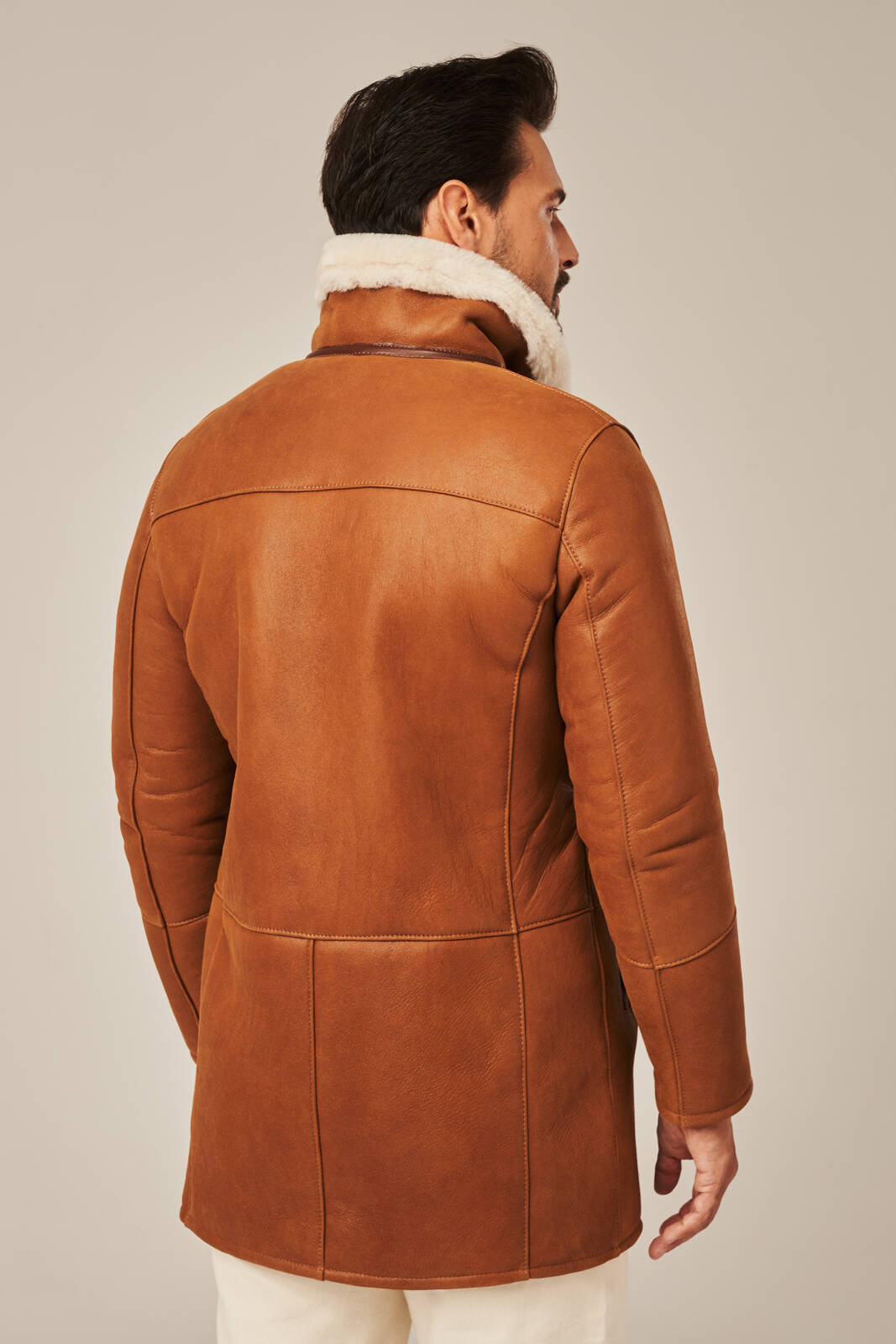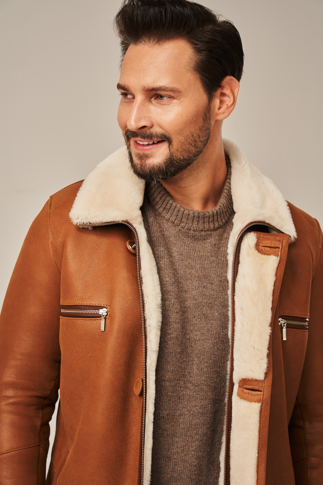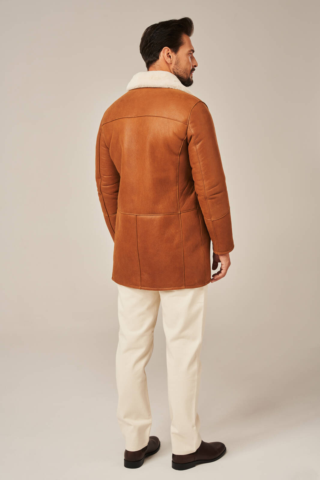 Ilgas vyriškas avikailio paltas žiemai – rudos spalvos, iš natūralios odos su avikailio kailiu. Stilingas ir šiltas ilgas vyriškas avikailio paltas, pagamintas iš impregnuotos natūralios ėriuko odos su šviesiu avikailio kailiu. Vidinė dalis iš minkšto, natūralaus kailio suteikia ypatingą komfortą ir apsaugą nuo šalčio net pačiomis atšiauriausiomis žiemos dienomis. Šis natūralios odos vyriškas kailinis paltas užsegamas mygtukais, turi dvi patogias įleistines kišenes šonuose ir dvi kišenes su užtrauktukais. Aukštai užsegamas apykaklės sprendimas leidžia apsisaugoti nuo vėjo ir suteikia papildomos šilumos kaklo sričiai. Kožuchas pasižymi klasikiniu, bet šiuolaikišku dizainu ir yra itin universalus – puikiai tinka tiek prie elegantiško kostiumo, tiek prie kasdienės aprangos su džinsais ir marškinėliais.