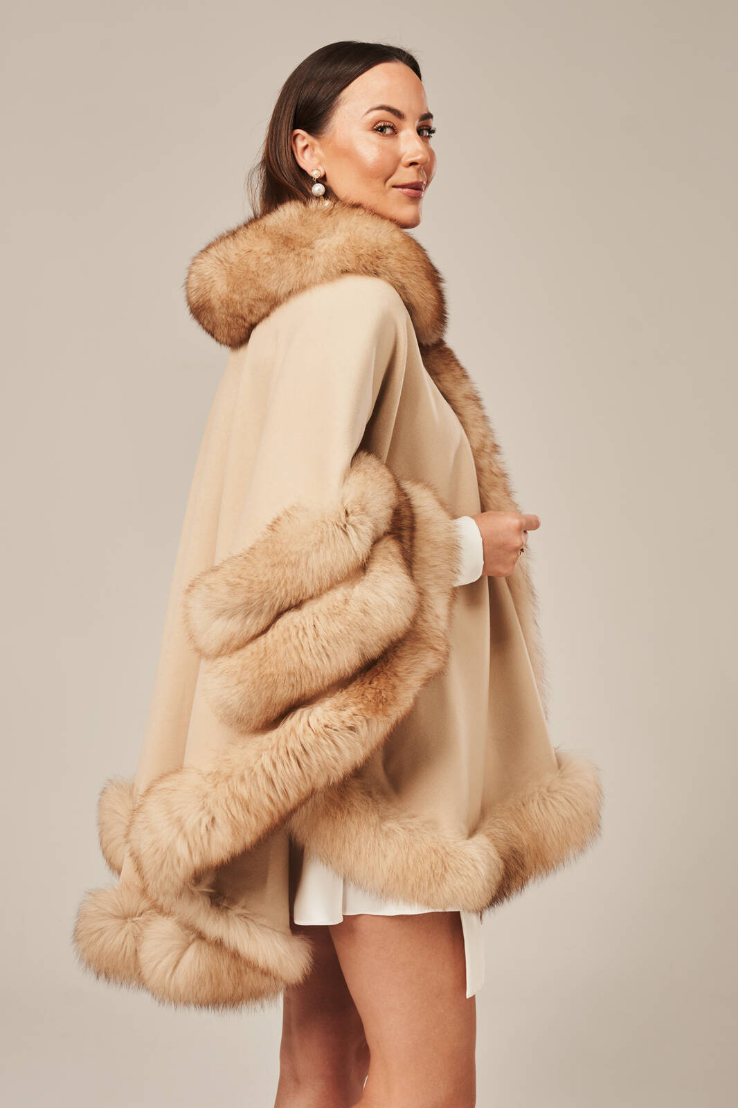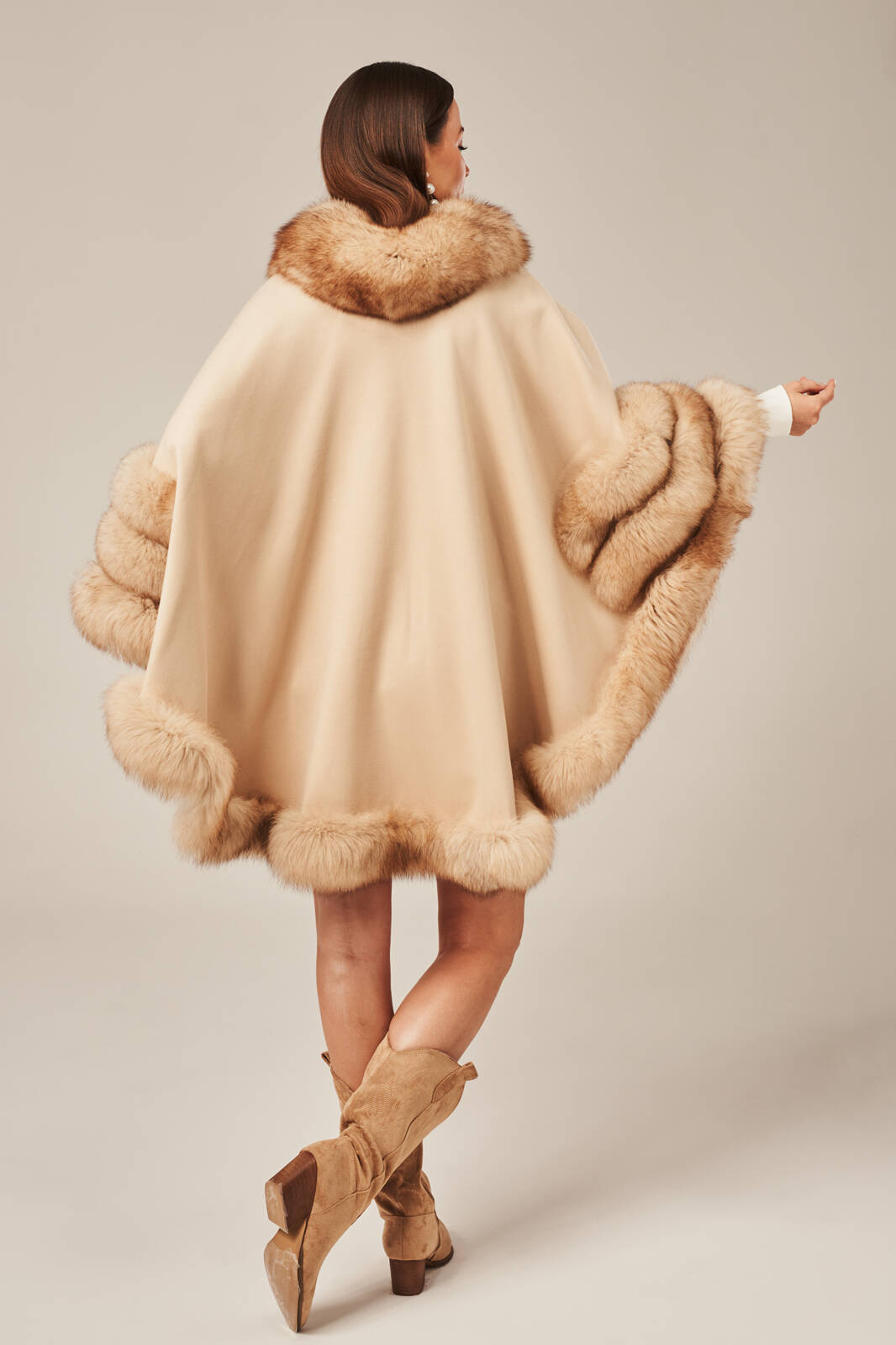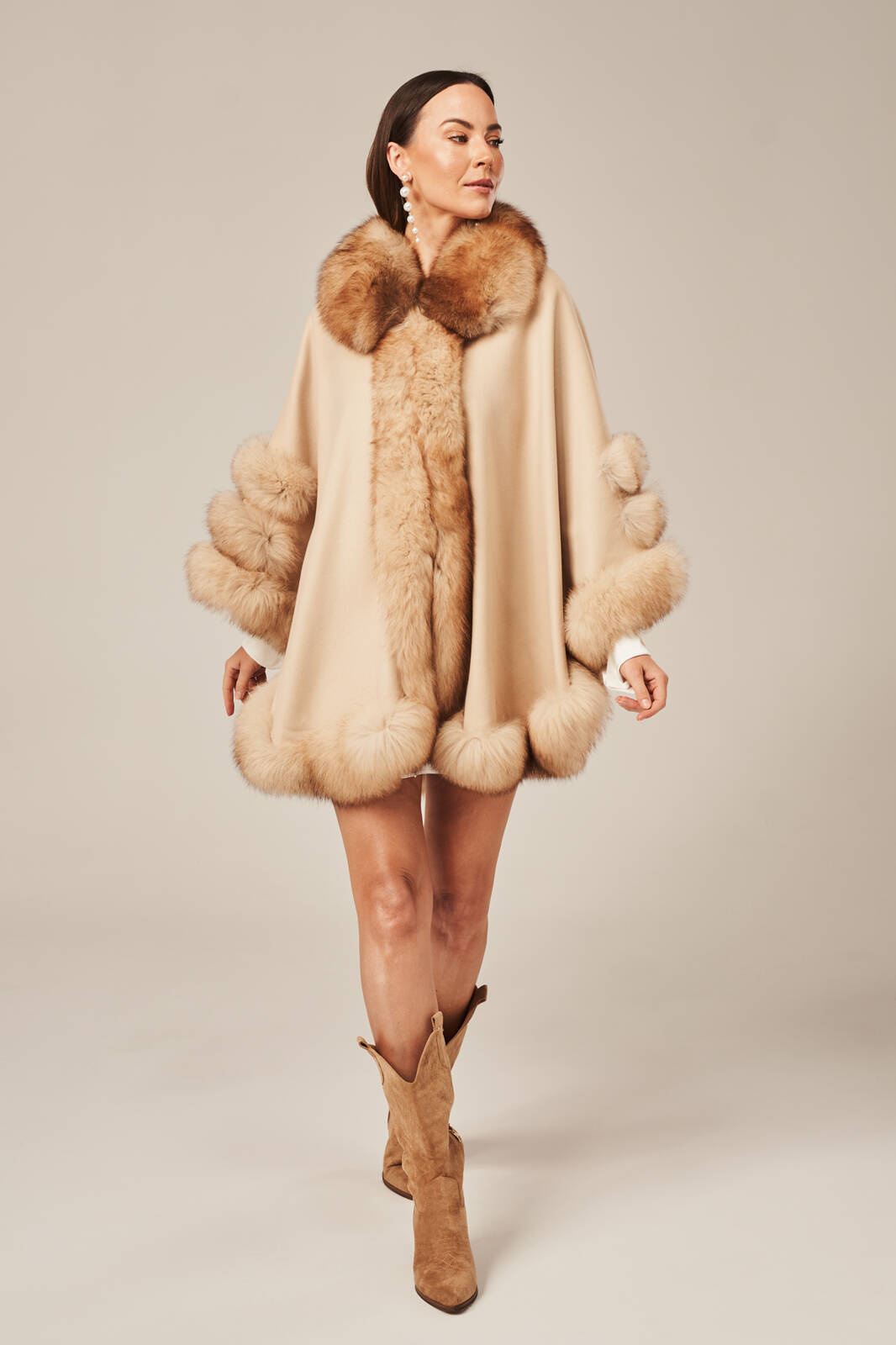 Moteriškas smėlio spalvos pončas su natūralaus lisko kailiu