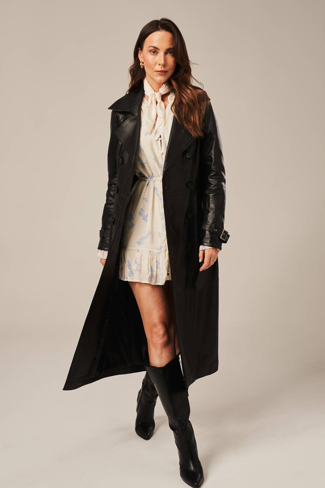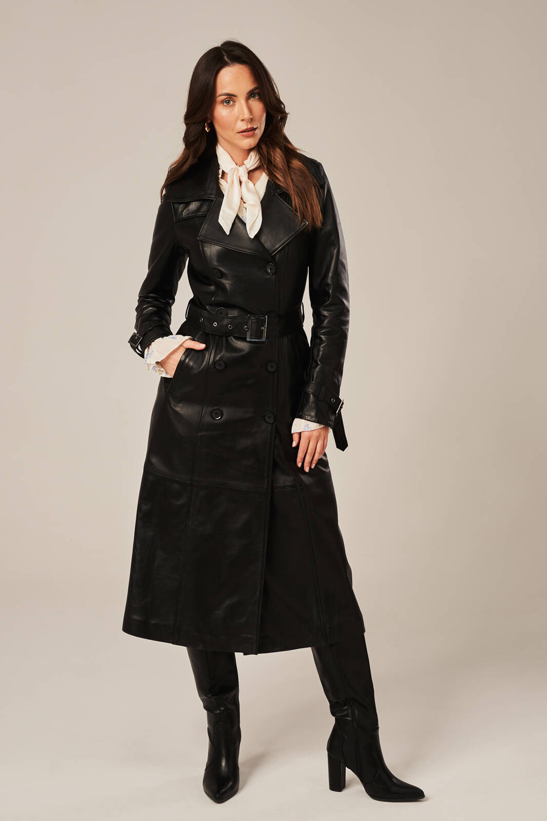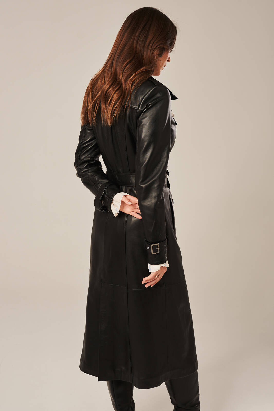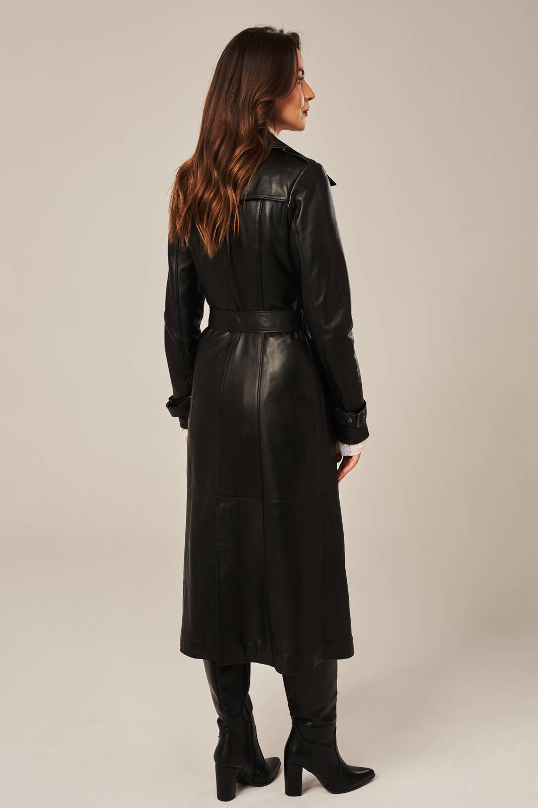 Ilgas moteriškas trenčas iš natūralios juodos odos – klasikinė elegancija pavasariui ir rudeniui