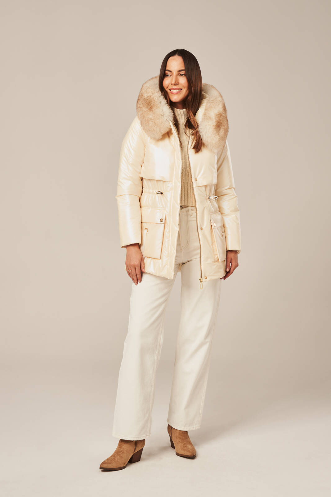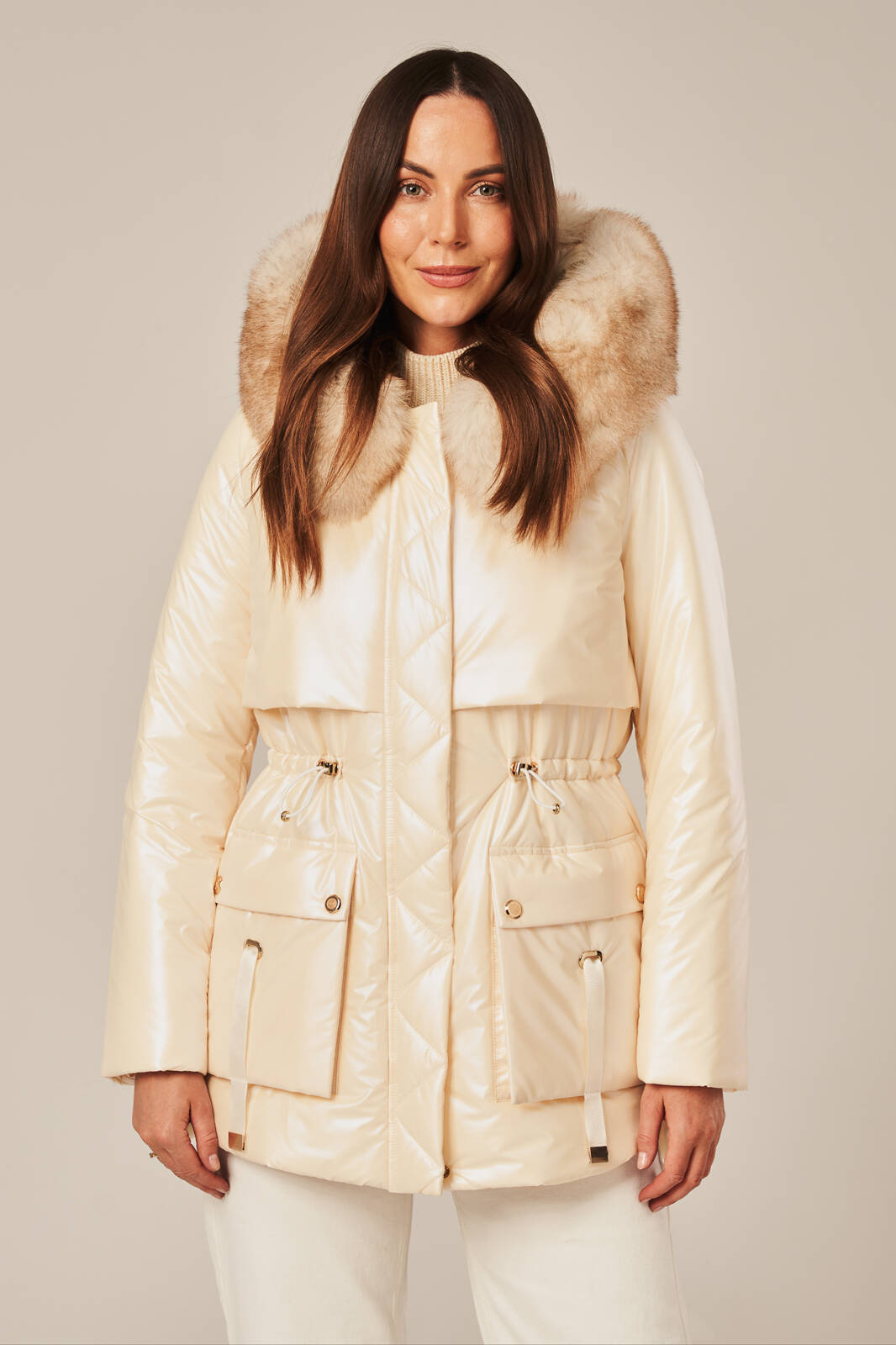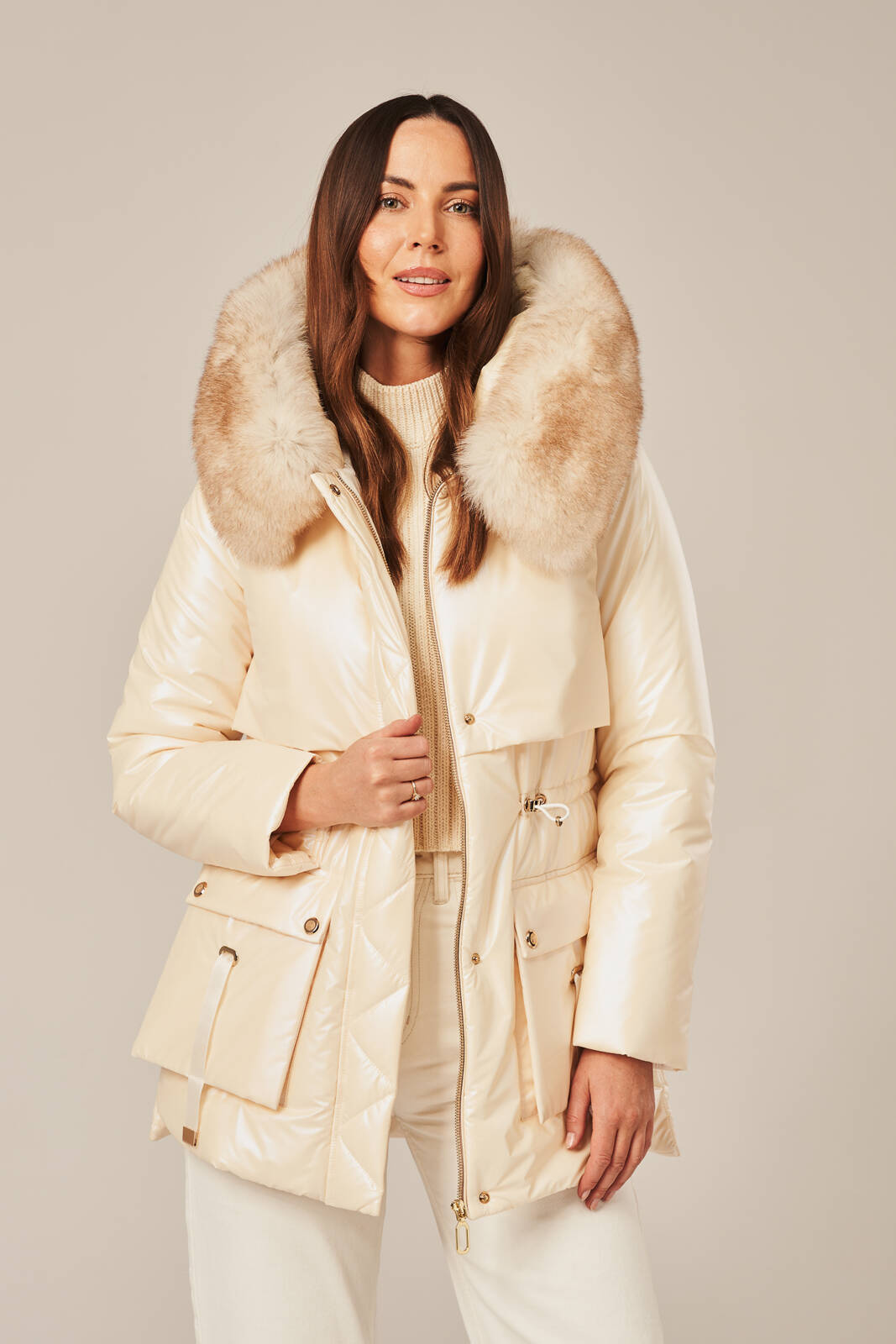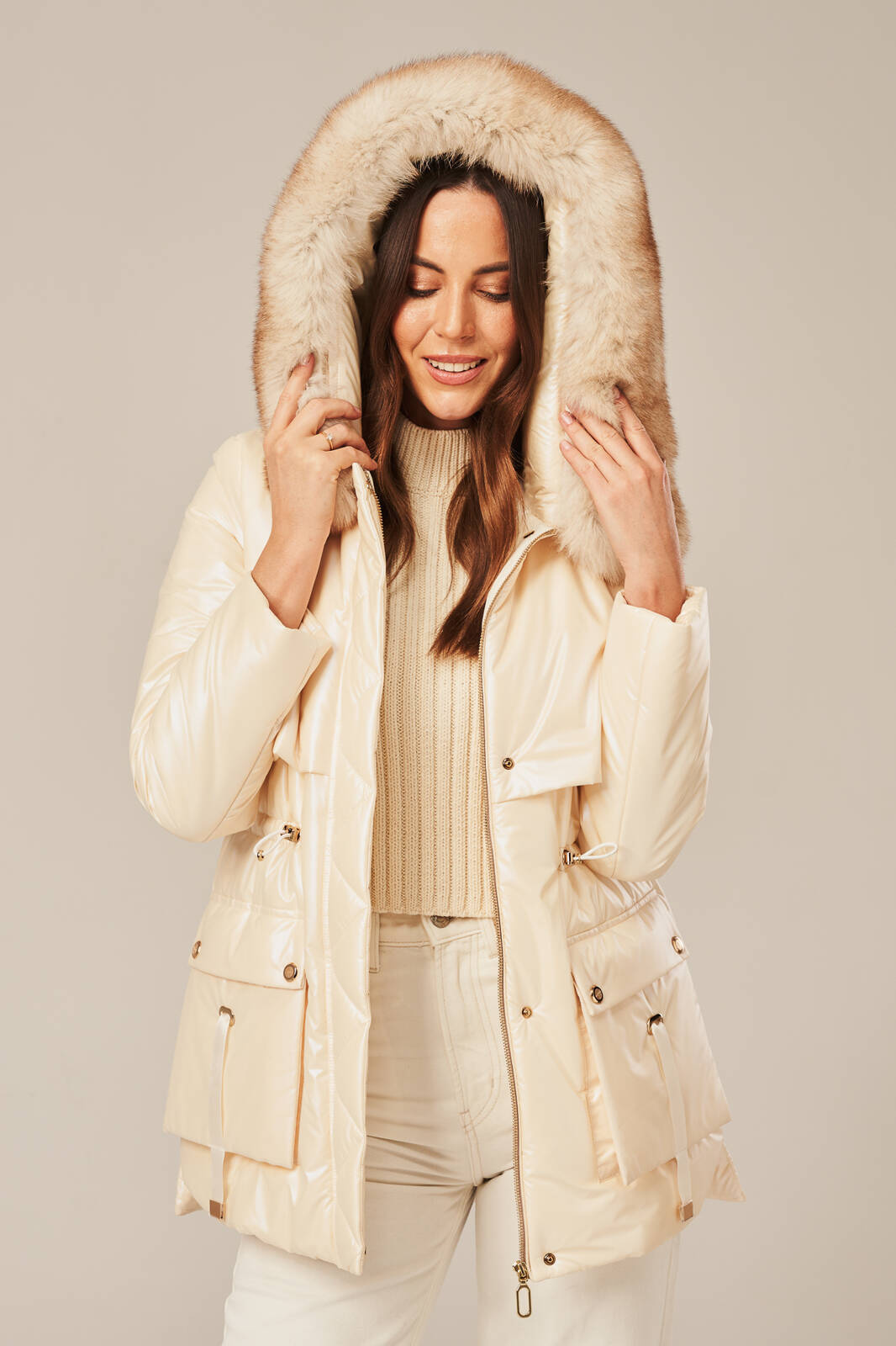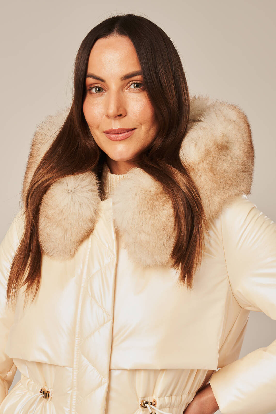 Moteriška smėlio spalvos lapės kailio pūkinė striukė – šiluma, elegancija ir prabanga viename modelyje Ilga pūkinė striukė moterims su kapišonu, pasiūta iš švelnaus, šilkinio prisilietimo audinio su subtiliu blizgesiu. Šviesi smėlio spalva suteikia lengvumo ir rafinuoto žavesio, todėl šis modelis puikiai tinka tiek kasdieniam dėvėjimui mieste, tiek ypatingoms progoms. Striukės paviršius švelniai spindi, pabrėždamas aukštos kokybės medžiagą su natūralaus šilko priemaiša. Modelis turi dvi patogias šonines kišenes ir integruotą gumą liemens srityje – tai leidžia idealiai priderinti striukę prie figūros. Kapišonas puoštas aukščiausios kokybės natūraliu lapės kailiu, kuris ne tik suteikia prabangos, bet ir užtikrina papildomą apsaugą nuo šalčio. Auksinės detalės – spaudės, užtrauktukai ir akcentai – subtiliai papildo bendrą įvaizdį, suteikdamos jam išskirtinumo ir elegancijos. Striukė užsegama tvirtu užtrauktuku ir spaudėmis, o jos vidus užpildytas hipoalerginiu „ecopuchu“ – tai lengvas, kvėpuojantis užpildas, kuris puikiai sulaiko šilumą net esant žemai temperatūrai. Dėl aukštos kokybės siuvimo ir funkcionalumo ši moteriška žieminė striukė yra puikus pasirinkimas šaltajam sezonui. Pūkinė striukė puikiai dera su vilnoniu megztiniu, džinsais ar aukštakulniais batais, todėl lengvai integruojama į įvairius žiemos derinius. Tai ne tik šilta, bet ir stilinga investicija į kokybišką garderobą.