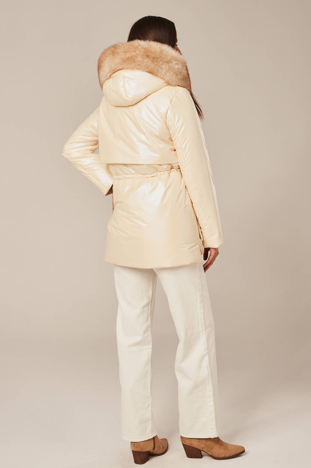 Moteriška smėlio spalvos lapės kailio pūkinė striukė