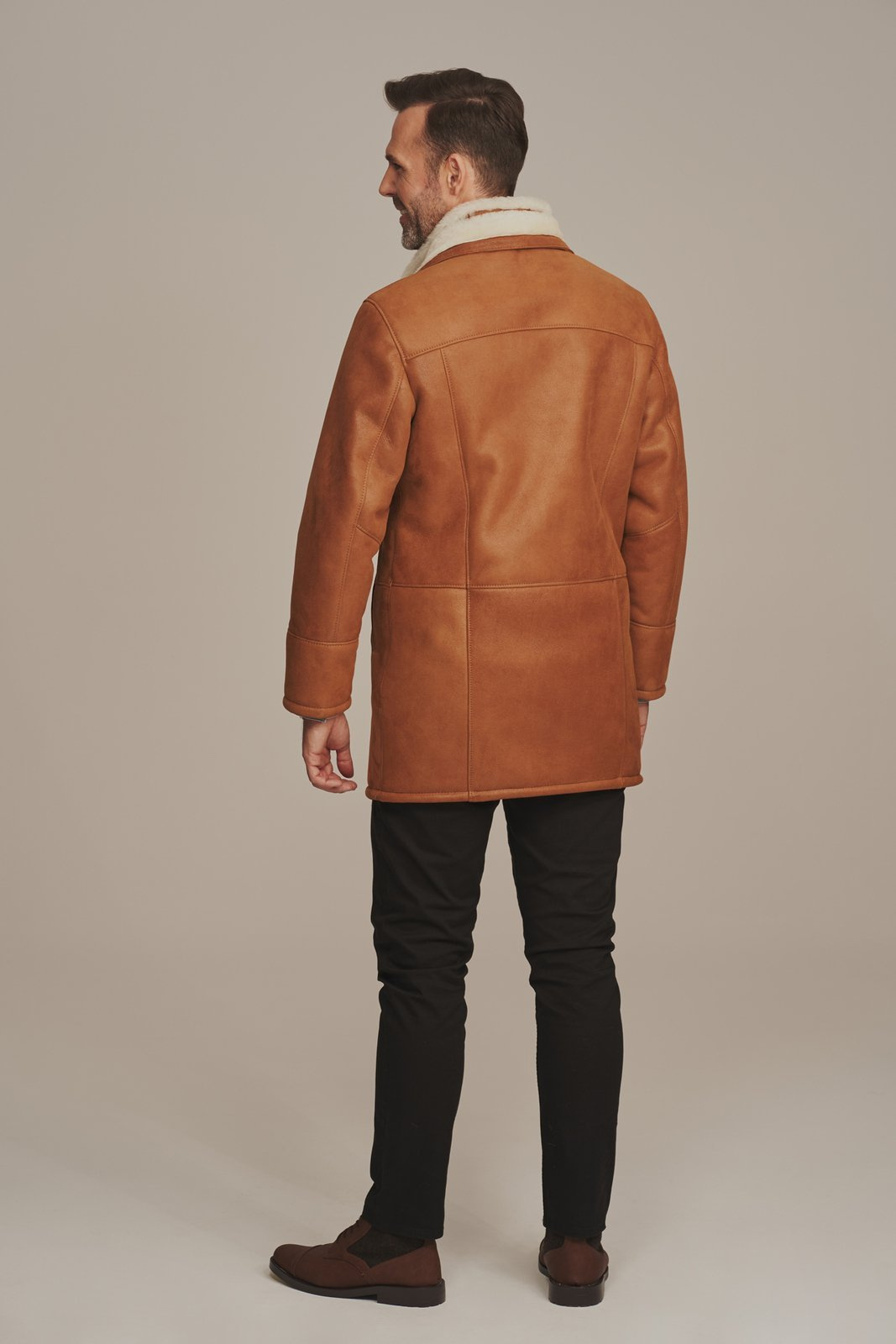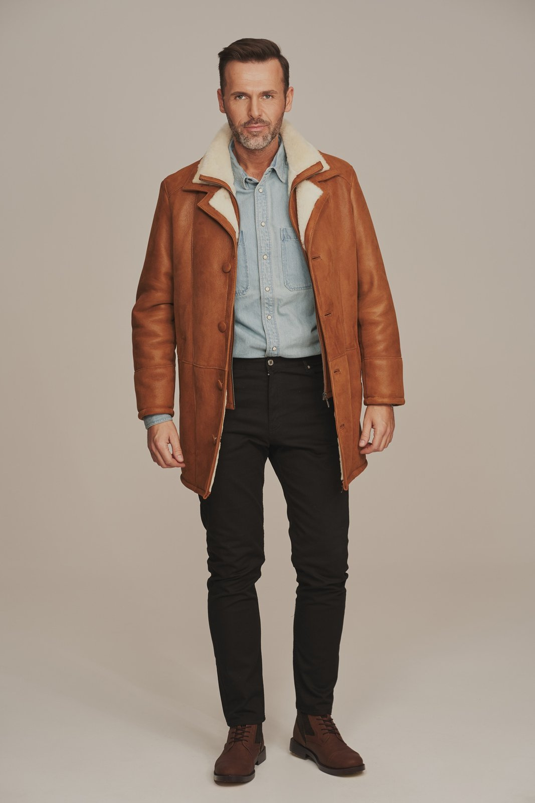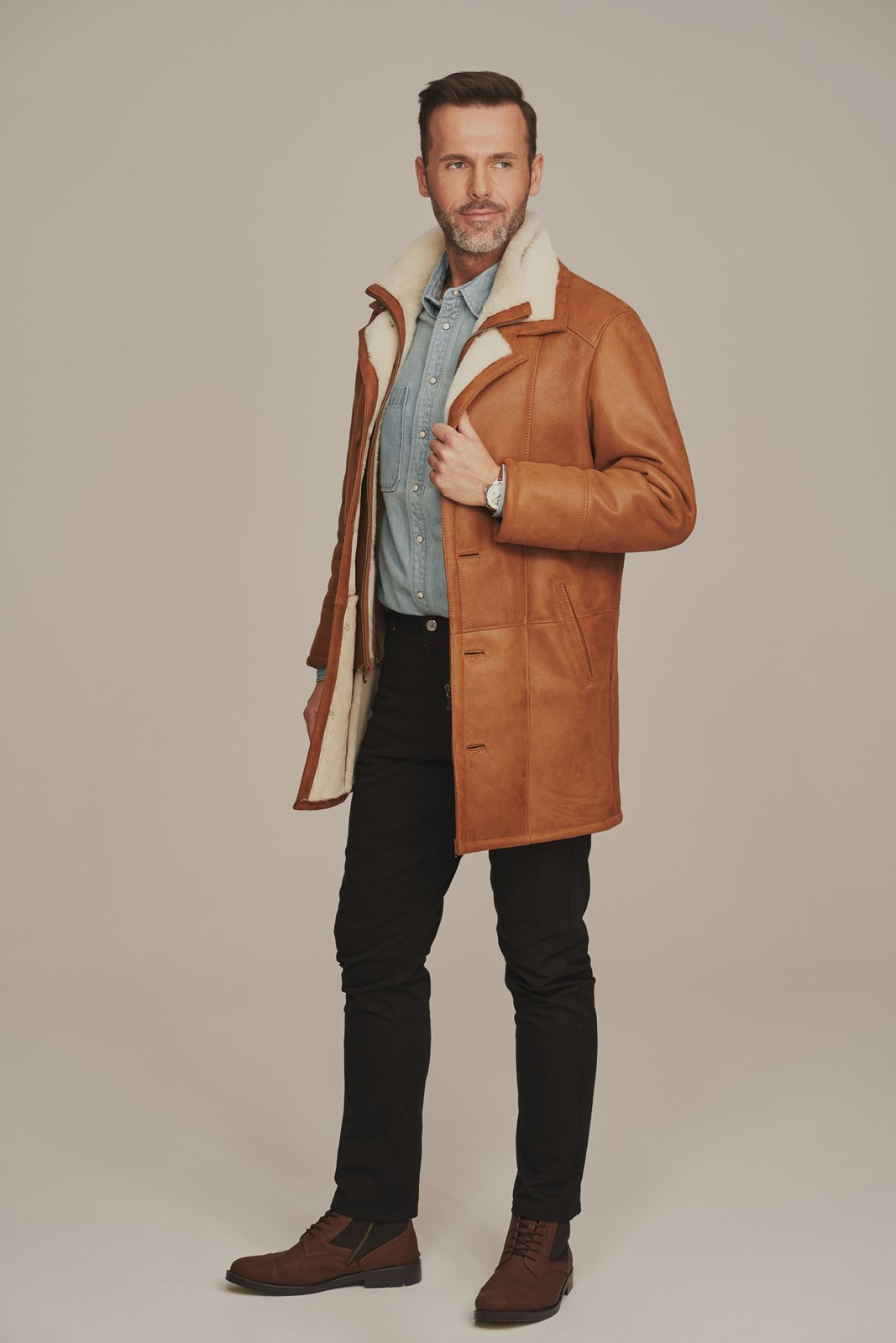 Rudas avikailio paltas vyrams su baltu kailiu – natūralus šilumos ir stiliaus derinys žiemai. Šis elegantiškas vyriškas avikailio paltas, pasiūtas iš aukščiausios kokybės natūralios avikailio odos, išsiskiria stilingu dizainu ir funkcionalumu. Modelis pritaikytas dėvėti žiemos sezonu, kai reikalingas šiltas, bet lengvas avikailio paltas vyrams. Šviesus baltas kailis viduje kontrastuoja su išoriniu rudu atspalviu, suteikdamas prabangos ir originalumo pojūtį. Paltas vyrams su baltu avikailiu yra ilgesnio modelio – dengia klubus, todėl puikiai dera dėvint virš švarko ar kostiumo. Šiltas avikailio paltas vyrams užsegamas klasikiniais mygtukais, o viduje turi papildomą, išimamą golf tipo užsegimą, kuris leidžia užsisegti iki pat kaklo – sprendimas tiems, kas nenori dėvėti šaliko.