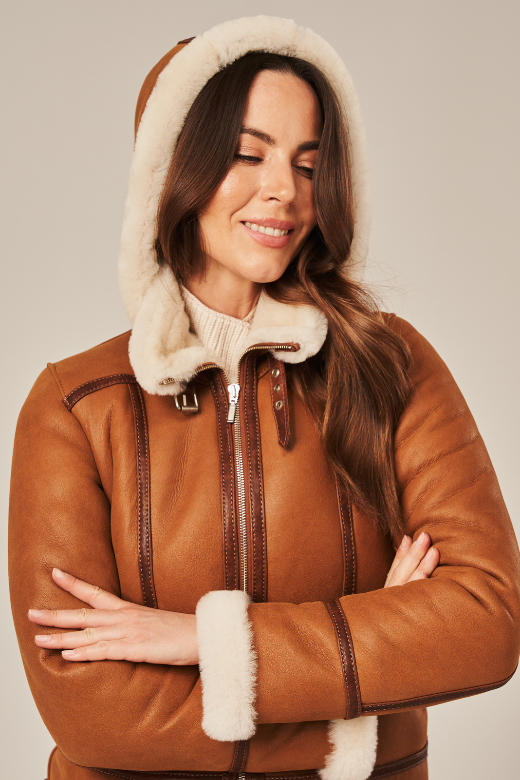 Moteriškas natūralus avių kailio paltas su gobtuvu, rudų atspalvių. Moteriškas avių kailio paltas pilotka tipo, pagamintas iš natūralių, lengvų ir minkštų avies odų su šviesiu kailiu. Viduje – švelni avikailio vilna, užtikrinanti šilumą, komfortą ir termoapsaugą net šalčiausiomis žiemos dienomis. Kailinis paltas užsegamas užtrauktuku, turi dvi užsegamas kišenes ir apykaklę, kurią galima užsegti stovimos apykaklės forma. Nusegamas gobtuvas yra praktiškas sprendimas, leidžiantis lengvai prisitaikyti prie oro sąlygų bei stiliaus poreikių. Šis moteriškas natūralus avių kailio paltas pilotka puikiai tinka kasdienėms stilizacijoms – jį galima derinti su džinsais, odinėmis kelnėmis ar suknele, sukuriant stilingą ir patogų žiemos įvaizdį.