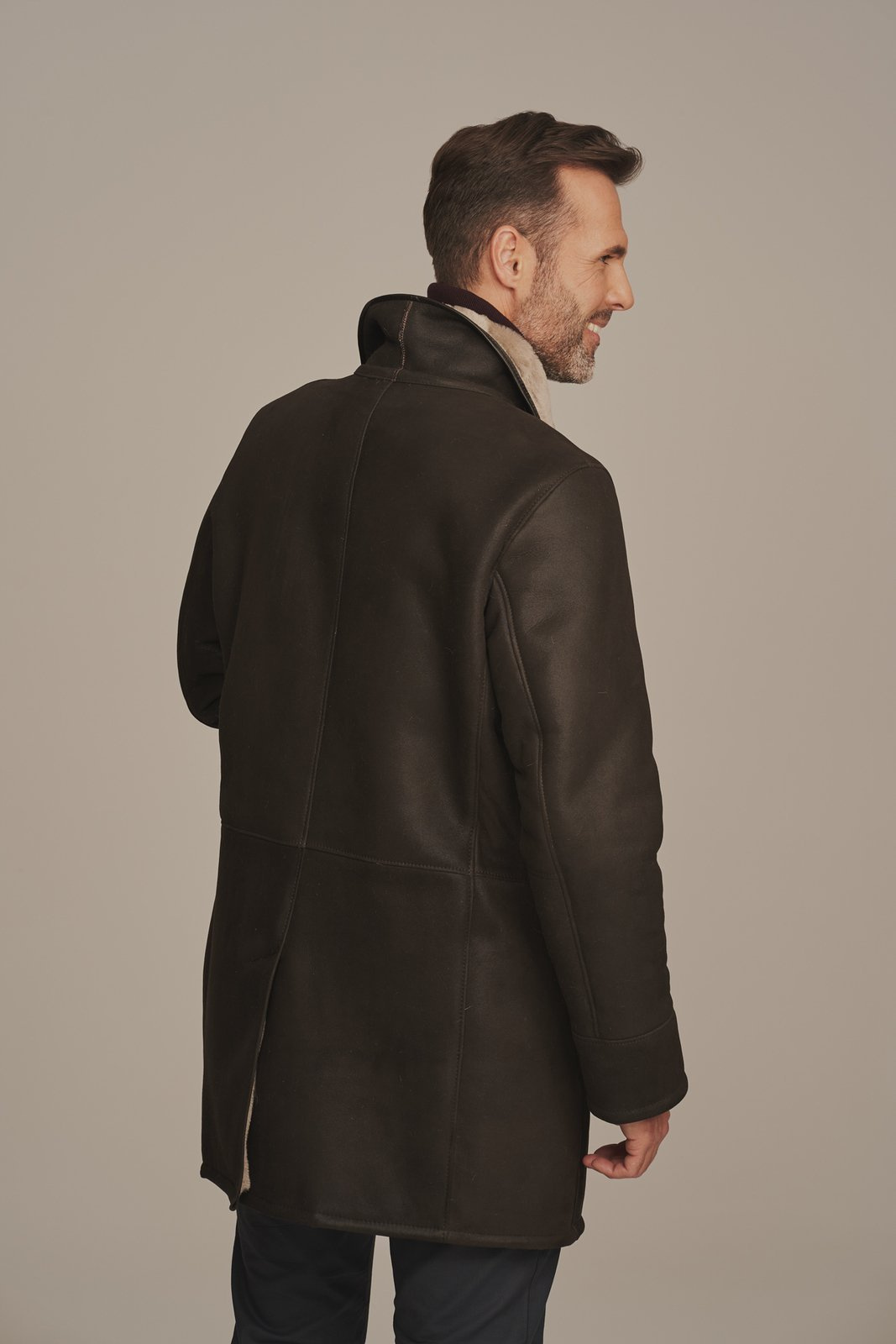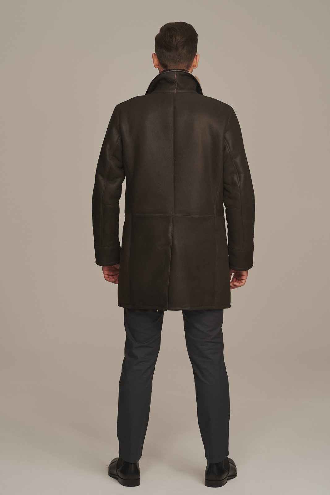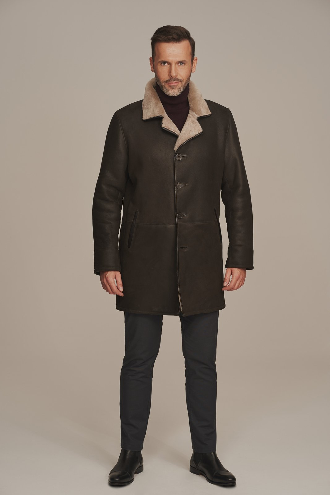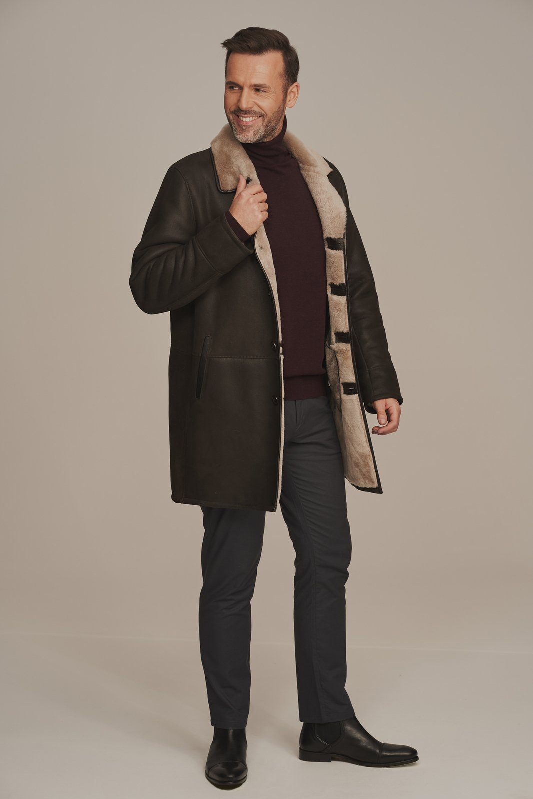 Elegantiškas vyriškas žieminis paltas – rudos spalvos, natūralios avikailio odos