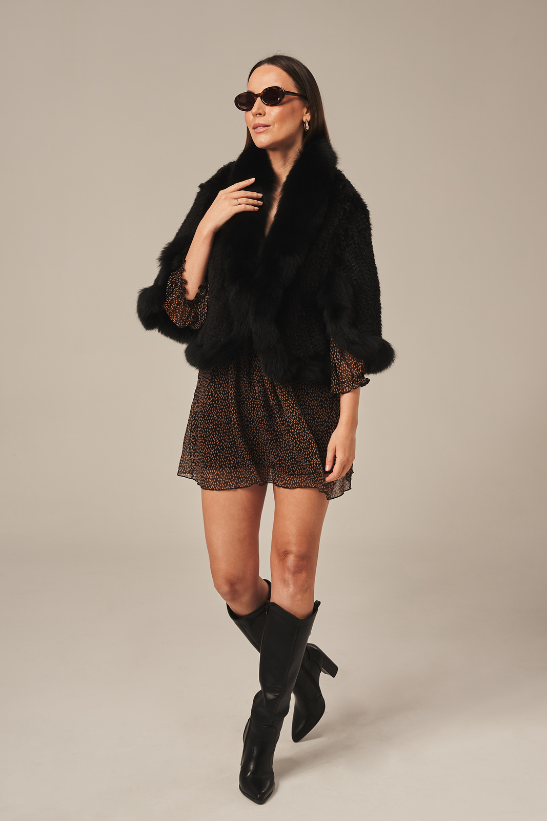 Juodas trumpas bolero iš tikro audinės kailio – elegantiškas, universalus pasirinkimas šiuolaikiškai moteriai, ieškančiai natūralios prabangos ir išskirtinio stiliaus. Šis moteriškas kailinis bolero su trumpomis rankovėmis pasiūtas iš švelnaus natūralaus audinės kailio, tvirtinamo ant kvėpuojančio aukštos kokybės tinklelio pagrindo, kuris užtikrina lengvumą ir patogumą. Visa bolero konstrukcija bei rankovių kraštai dekoruoti natūraliu juodu lapės kailiu, kuris sukuria subtilų kontrastą faktūrų ir suteikia rafinuoto žavesio. Trumpa forma iki liemens leidžia drabužiui lengvai derėti su elegantiškomis suknelėmis ar klasikinėmis kelnėmis. Delikati stovelio tipo apykaklė bei paslėptos kabutės užtikrina minimalistinį siluetą ir maksimalų dėvėjimo komfortą. Tai juodas audinės kailio bolero, kuris ne tik šildo, bet ir tampa ryškiu akcentu kiekviename įvaizdyje. Idealiai tinka dėvėti pavasarį ir rudenį, taip pat vėsesniais vasaros vakarais arba žiemos metu kaip stilingas sluoksnis po paltu. Šis trumpas moteriškas kailinis švarkelis iš natūralaus kailio yra ne tik funkcionalus, bet ir išlieka aktualus metai iš metų.
