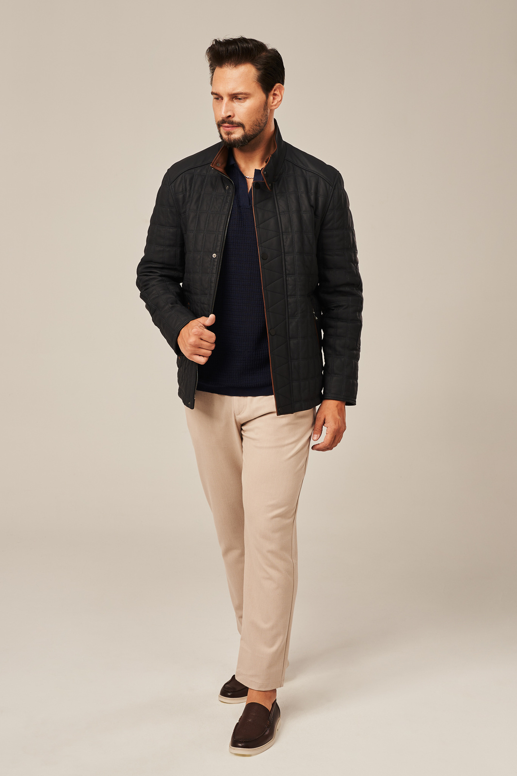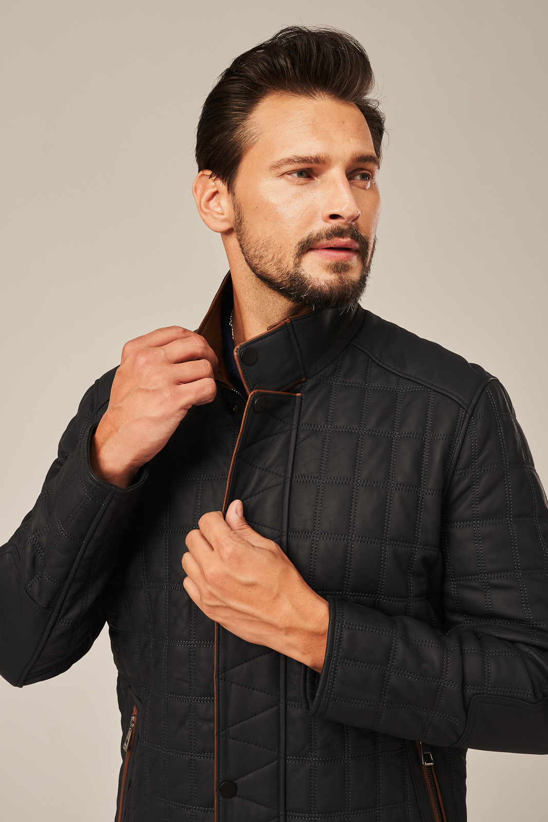 Vyriška grafito spalvos odinė striukė – klasika su išskirtinėmis detalėmis. Vyriška odinė striukė grafito spalvos, pasiūta iš lengvos ir minkštos natūralios avies odos, pasižymi subtiliu stiliumi ir išskirtiniu patogumu. Tai šiek tiek pašiltinta vyriška striukė, puikiai tinkanti pereinamajam sezonui – pavasariui ar rudeniui. Modelis turi uždengiamą užtrauktuką, kuris išlaiko minimalistinę išvaizdą ir tvarkingą siluetą. Striukėje yra dvi išorinės kišenės, praktiškai įkomponuotos į dizainą. Kontrastingos rudos spalvos avies odos detalės ties kišenėmis, apykakle ir užtrauktuku suteikia originalumo ir išskirtinumo. Ši klasikinio kirpimo odinė striukė vyrams gali puikiai atstoti švarką – ji tinka tiek prie elegantiškesnio įvaizdžio, tiek prie kasdienio miesto stiliaus. Vyriška striukė iš natūralios avies odos – tai investicija į kokybišką, universalią ir ilgaamžę viršutinę aprangą, kuriai nesvetimos nei funkcija, nei estetika.