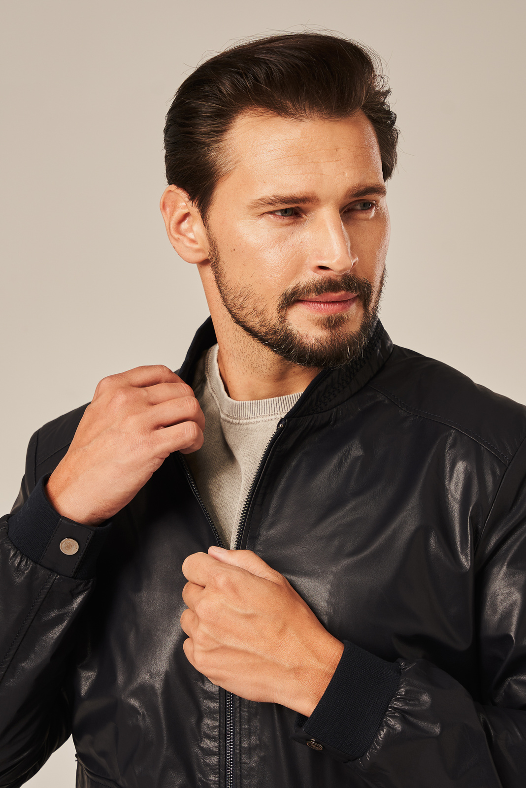 Vyriška tamsiai mėlyna odinė striukė – patogi klasika kasdieniam stiliui. Vyriška odinė striukė tamsiai mėlyna, pasiūta iš aukštos kokybės natūralios avies odos, pasižymi išskirtiniu minkštumu, patvarumu ir ilgaamžiškumu. Tamsus mėlynas atspalvis suteikia striukei universalumo – ją lengva derinti tiek prie laisvalaikio, tiek prie pusiau formalių drabužių. Modelis kurtas pagal klasikinį švediško tipo kirpimą – tai tiesi forma su aiškia struktūra ir subtiliomis detalėmis. Striukė užsegama metalinio užtrauktuko pagalba, o stovintis, švelnus kaklas suteikia modernumo bei švarų siluetą. Apačioje integruotas paslėptas medvilninis tamprus juosmuo leidžia striukei patogiai priglusti prie klubų, prisitaikant prie figūros be varžymo. Vidus išklotas kokybišku pamušalu, kuris suteikia komfortą bei laidumą orui. Dvi įleistos kišenės šonuose – praktiškas sprendimas kasdieniam naudojimui. Ši vyriška striukė iš avies odos puikiai tinka pavasariui ir rudeniui, kai norisi lengvo, bet stilingo viršutinio drabužio. Lengva odinė striukė vyrams kasdienai – tai sprendimas tiems, kurie vertina funkcionalumą, komfortą ir subtilų, nepavaldų laikui stilių.