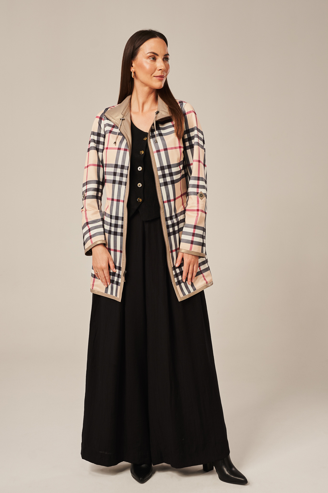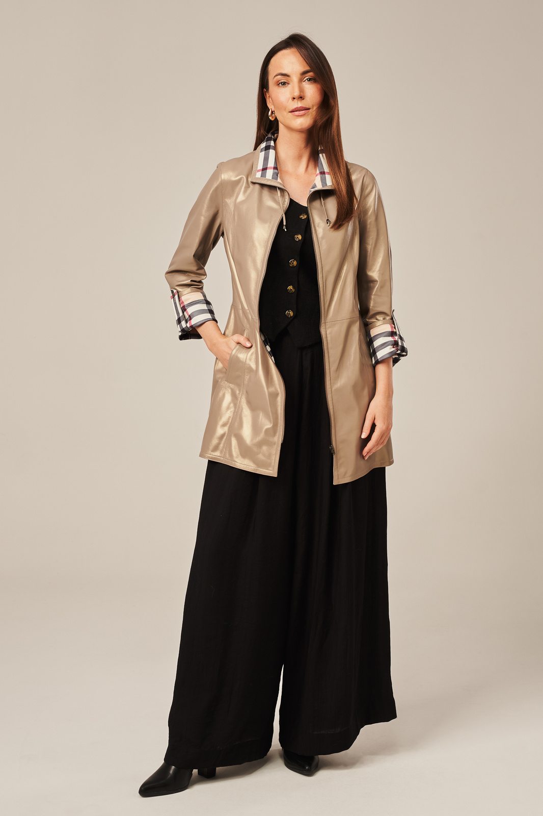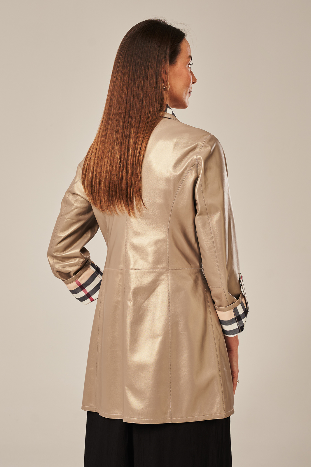 Dvipusė moteriška odinė striukė cappuccino spalvos – stilinga, universali ir praktiška. Išskirtinio dizaino dvipusė moteriška odinė striukė, pasiūta iš natūralios avikailio odos, spinduliuoja subtilumu ir elegancija. Švelni cappuccino spalva su perlamutriniu blizgesiu suteikia striukei rafinuoto žavesio, o praktiškas dizainas leidžia ją dėvėti iš abiejų pusių – lyg turėtum du skirtingus drabužius viename. Striukės vidus dekoruotas aukštos kokybės pamušalu su klasikiniu languotu raštu, kuris puikiai dera prie išorės spalvos ir suteikia papildomo stiliaus akcentą. Modelis turi keturias įleistines kišenes – po dvi kiekvienoje pusėje – bei užsegamas užtrauktuku, kad būtų patogu kasdien. Stovė gėlės tipo apykaklė, galimybė atsilenkti rankoves iki ¾ ilgio ir šiek tiek prailginta, liemenuota forma daro šią striukę puikiu pasirinkimu pavasariui ir rudeniui – kai norisi lengvos, bet šiltos odinės aprangos. Tai ne tik striukė, bet ir ilgesnis odinis paltas moterims, kuris puikiai dera tiek prie laisvalaikio džinsų, tiek prie klasikinės suknelės ar kelnių.