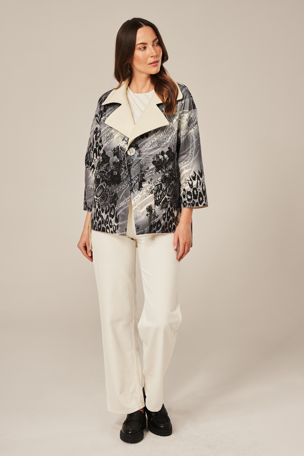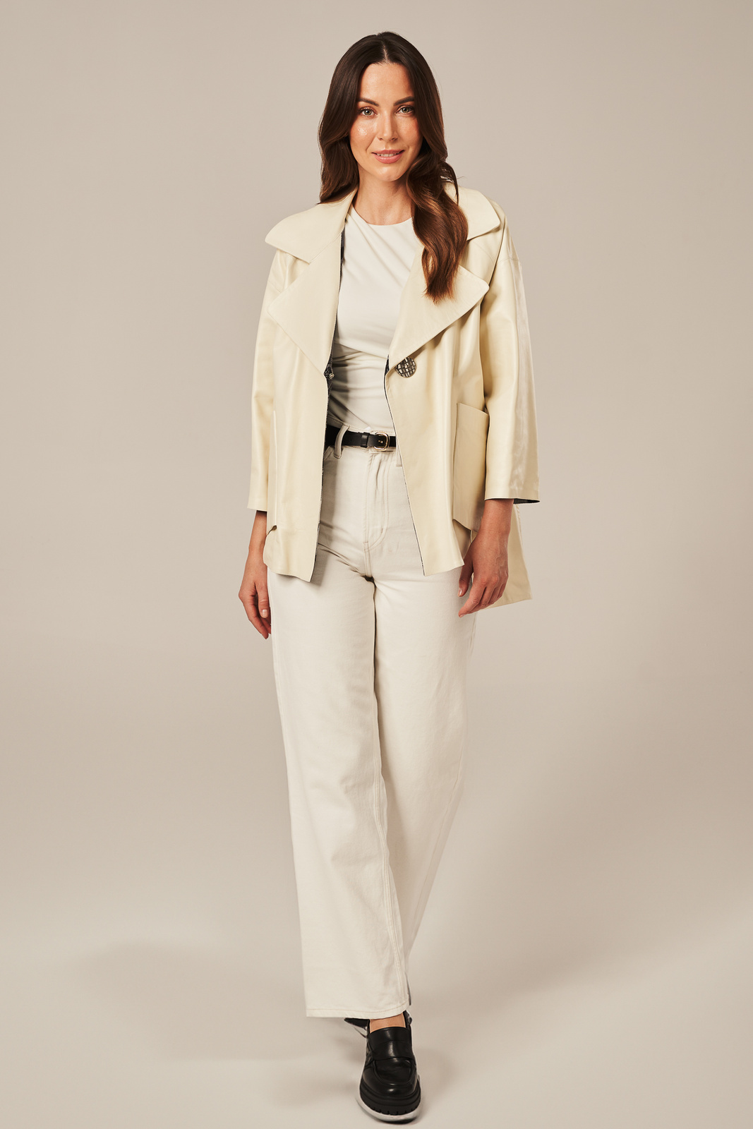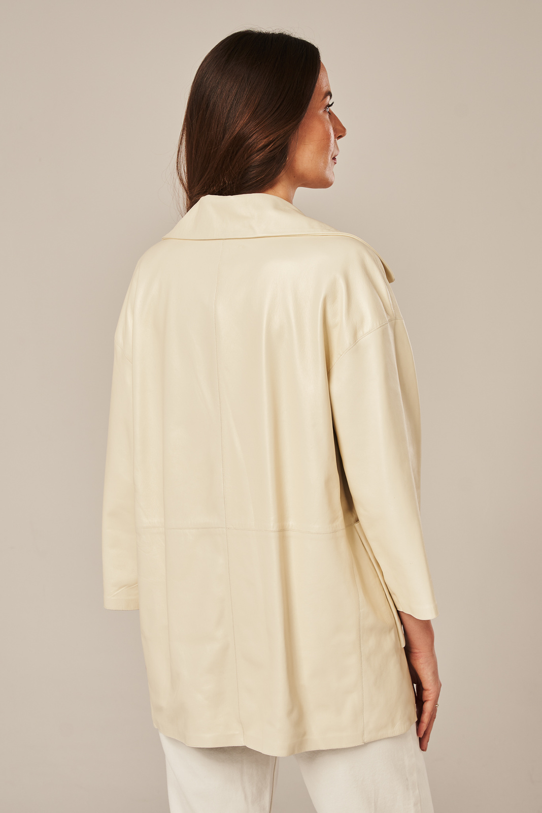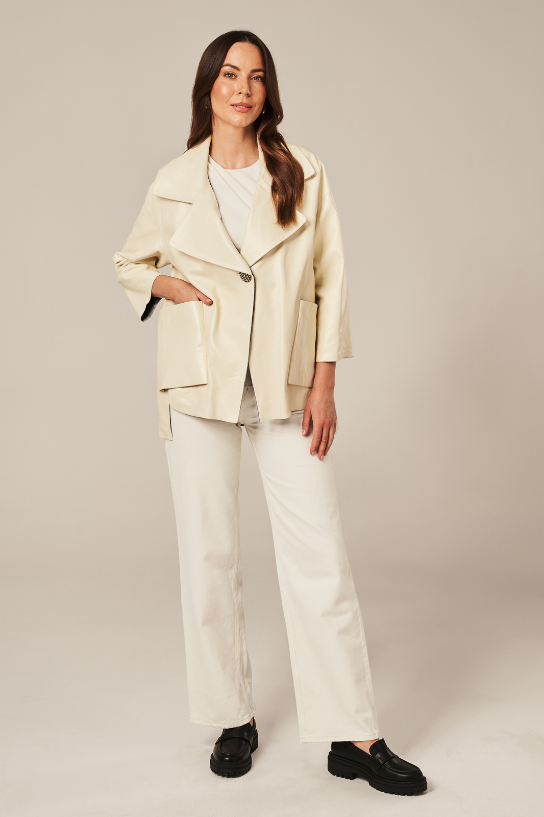 Smėlio spalvos moteriška odinė striukė – elegantiškas pasirinkimas pavasariui ir rudeniui. Smėlio spalvos moteriška odinė striukė, pasiūta iš aukštos kokybės natūralios, minkštos ir lengvos avikailio odos, išsiskiria subtiliu atspalviu ir moterišku siluetu. Modelis išklotas aukštos kokybės pamušalu, kuris užtikrina komfortą bei ilgaamžiškumą. Striukė užsegama vienu dekoratyviniu mygtuku, o stilingi platūs atvartai suteikia išraiškingumo ir modernumo. Dvi įleistinės kišenės puikiai papildo minimalistinį dizainą. Priekinė dalis trumpesnė, o nugara pailginta – tai vizualiai ilgina figūrą ir sukuria lengvumo įspūdį. Ši natūrali avikailio odinė striukė yra puikus pasirinkimas pereinamajam sezonui – tiek pavasariui, tiek rudeniui. Puikiai dera su „mom“ arba „boyfriend“ džinsais, o vėsesnėmis dienomis – su vilnoniu megztiniu, chinos kelnėmis ir aulinukais. Tai – universali, stilinga ir elegantiška pereinamojo sezono striukė moterims, kuri puikiai pritaikoma tiek kasdienėms veikloms mieste, tiek išskirtinėms progoms.