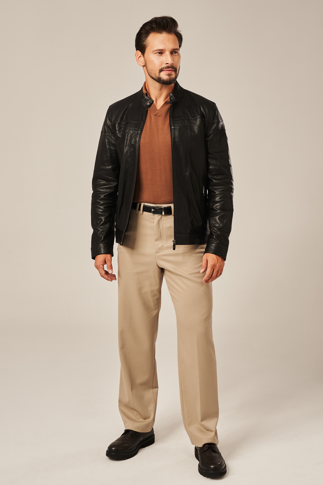 Vyriška juoda odinė striukė pagaminta iš aukščiausios kokybės natūralios avikailio odos su grublėta tekstūra. Ši vyriška odinė striukė pasižymi paprastu ir klasikinio stiliaus dizainu, kuris niekada neišeina iš mados. Užsegama patikimu užtrauktuku, turi aukštos kokybės pamušalą, kuris užtikrina komfortą ir šilumą. Striukėje yra dvi užsegamos kišenės bei stilingas stovimas apykaklės modelis, kuris suteikia elegancijos ir apsaugo nuo vėjo. Vyriška odinė striukė puikiai dera su klasikiniu džinsų ir marškinėlių deriniu kasdienai, taip pat su elegantiška palaidine ir chinos kelnėmis – tinkama tiek laisvalaikiui, tiek formalesnėms progoms.