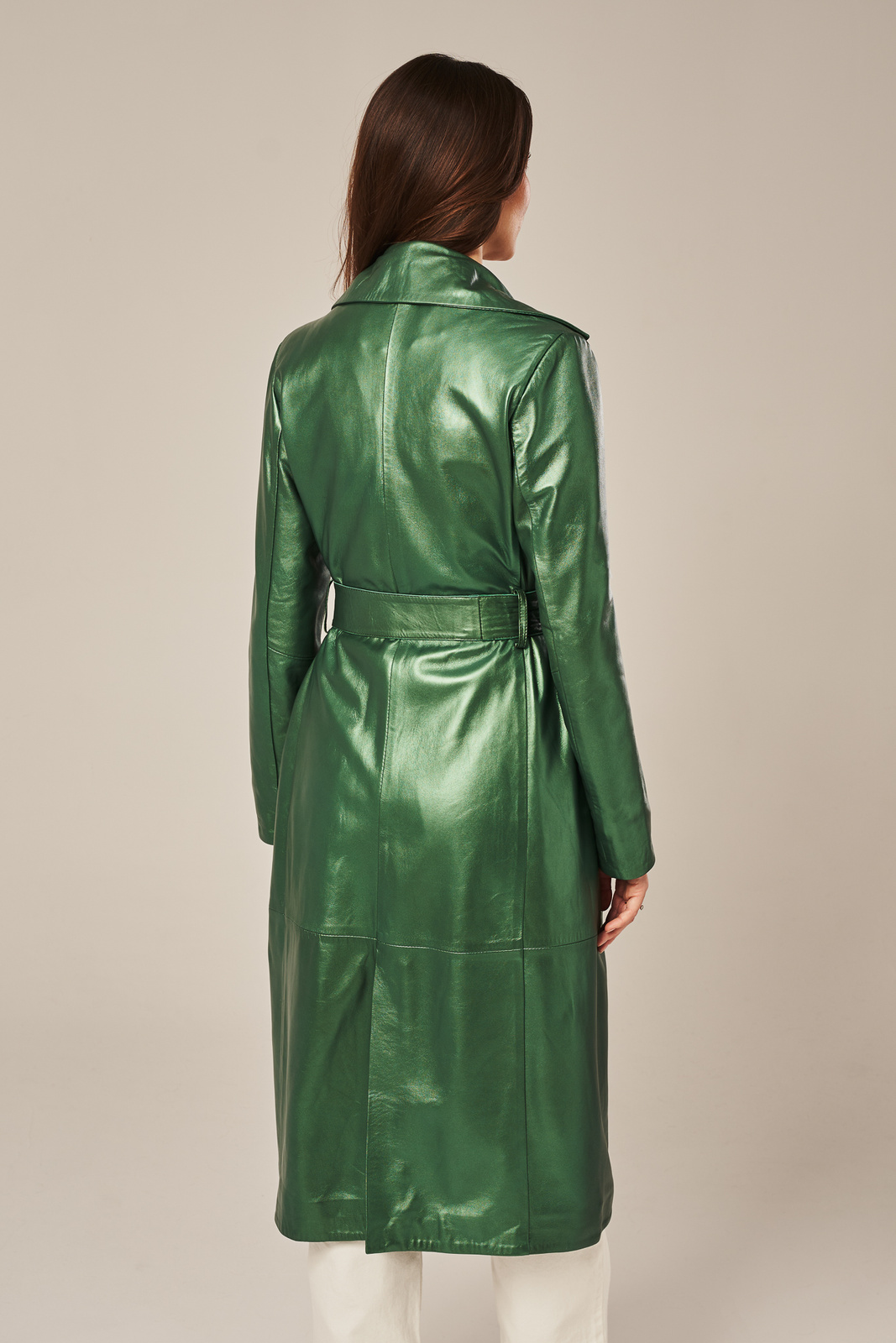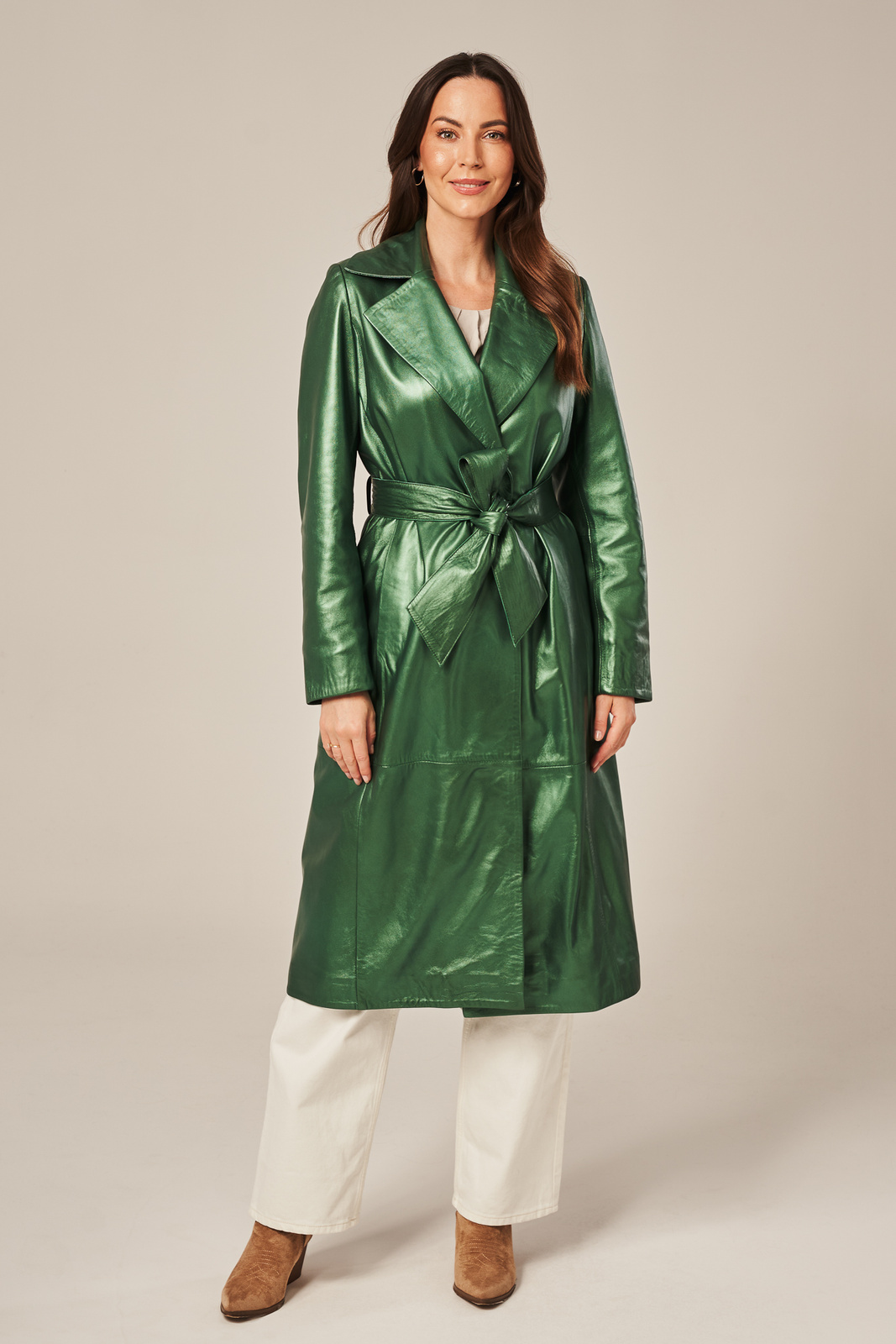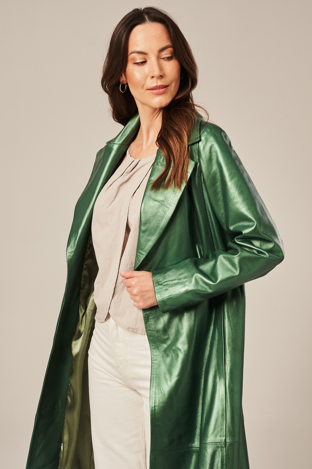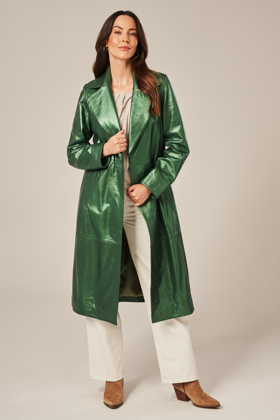 Moteriškas odinis paltas iš avikailio – elegancija rudens ir pavasario sezonui. Stilingas moteriškas odinis paltas iš aukščiausios kokybės lengvos ir minkštos avikailio odos – tai idealus pasirinkimas ieškančioms elegancijos, komforto ir išskirtinio dizaino viename. Šis butelių žalios spalvos odinis paltas moterims su subtiliu blizgesiu puikiai dera tiek prie rudens, tiek prie pavasario aprangos. Klasikinis moteriškas odinis paltas su didelėmis atlapomis ir švarko tipo užsegimu stilingai pabrėžia figūrą ir suteikia galimybę individualiai reguliuoti liemens plotį dėl rišamo diržo. Viduje – aukštos kokybės pamušalas, užtikrinantis komfortą visą dieną. Dvi įleistinės kišenės suteikia praktiškumo, išlaikant elegantišką siluetą. Tai pereinamasis moteriškas paltas, kuris dėl savo klasikinio kirpimo ir nepriekaištingos medžiagų kokybės tarnaus ilgus sezonus. Šis moteriškas ilgas odinis paltas – puikus pasirinkimas norinčioms išsiskirti stilingu, tačiau universaliu viršutiniu drabužiu. Atrask madingą odinį paltą moterims internetu Lietuvoje ir papildyk savo garderobą kokybišku, prabangiu drabužiu, kuris ne tik šildo, bet ir pabrėžia tavo individualumą.