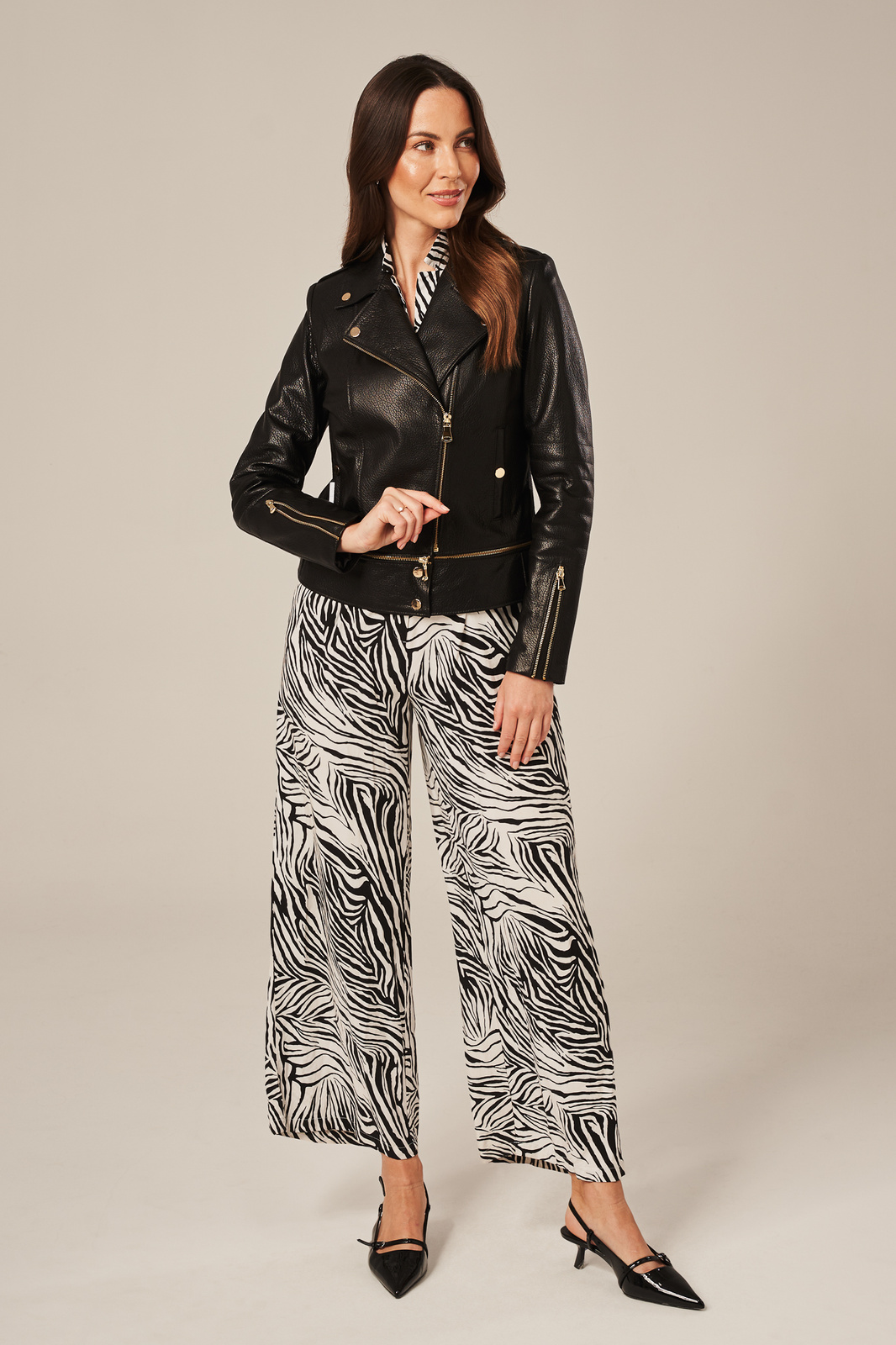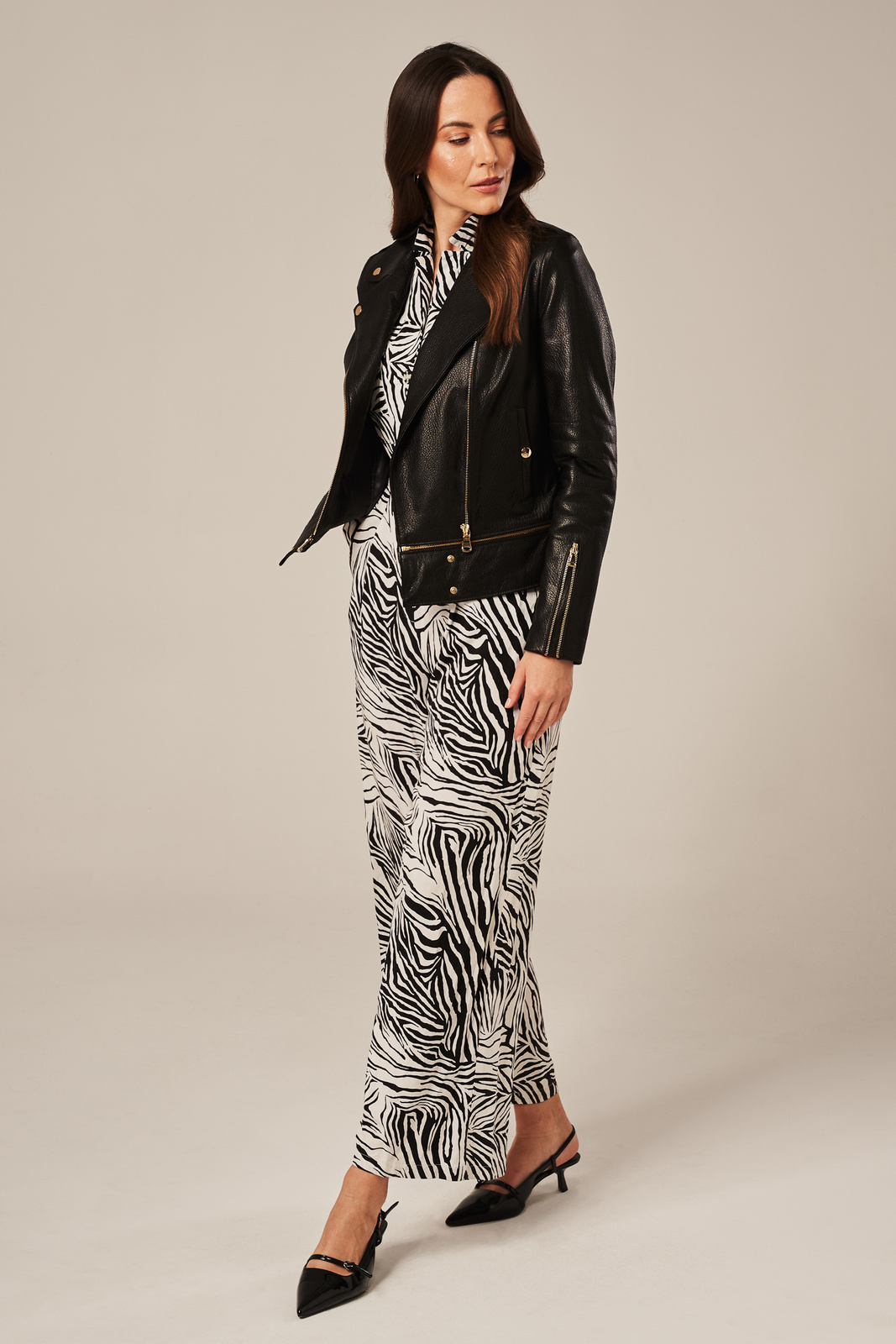 Juoda moteriška odinė striukė iš natūralaus avikailio – 2 ilgių modelis viename. Moteriška odinė striukė pagaminta iš aukštos kokybės natūralios avikailio odos, kuri išsiskiria lengvumu, švelnumu ir malonia tekstūra su šiek tiek grublėtu paviršiumi. Juoda spalva kartu su sendinto aukso spalvos detalėmis kuria elegantišką, bet tuo pačiu ryškų įvaizdį. Striukė užsegama į šoną paslinktu užtrauktuku, turi dvi užsegamas kišenes ir yra išklota aukštos kokybės pamušalu. Konstrukcijoje numatyta unikali funkcija – nuimama apatinė dalis, leidžianti keisti ilgį pagal situaciją ar nuotaiką. Trumpesnė versija tinka kasdienai ir miesto stiliui, o ilgesnė – vėsesniems orams ar elegantiškesniam deriniui. Tai ne tik moteriška avikailio striukė, bet ir stilingas sprendimas norinčioms daugiau lankstumo garderobe. Klasikinė ramones stiliaus striukė praturtinta šiuolaikiškomis detalėmis, todėl dera tiek prie kasdienio džinsų įvaizdžio, tiek prie suknelės ar formalesnių derinių. Natūrali odinė striukė moterims, kuri jungia funkcionalumą, miesto estetiką ir drąsų charakterį. Puikus pasirinkimas rudeniui ir pavasariui .