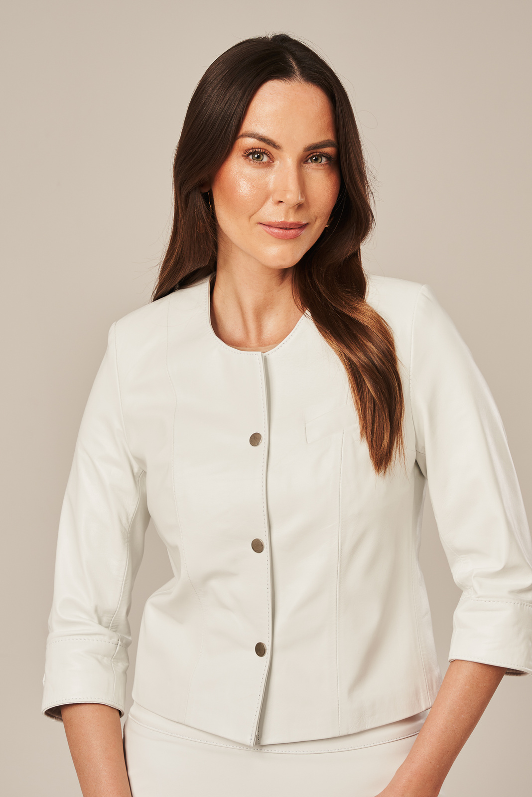 Balta moteriška natūralios odos striukė – elegancija, kuri išlieka madinga. Šis baltas moteriškas odinis švarkas pagamintas iš aukščiausios kokybės natūralios avikailio odos, kuri pasižymi ypatingu minkštumu, lengvumu ir patogumu. Modelis užsegamas spaudėmis, turi subtilų Chanel tipo apykaklę ir elegantiškas ¾ ilgio rankoves, kurios suteikia lengvumo pojūtį ir moteriško žavesio. Viduje – aukštos kokybės pamušalas, užtikrinantis komfortą visos dienos metu. Ši trumpa moteriška odinė striukė idealiai tinka tiek oficialioms progoms, tiek kasdieniam stiliui. Puikiai atrodo dėvima su odine sijonu iš tos pačios medžiagos, sukuriant elegantišką biuro ar vakarėlio įvaizdį. Taip pat lengvai derinama su vilnoniu megztiniu ir aulinukais, kai norisi stilingo, bet laisvesnio kasdienio derinio. Moteriškas odinis švarkas balta spalva – tai ne tik elegantiškas, bet ir universalus garderobo akcentas. Toks drabužis išlieka aktualus daugelį sezonų, suteikdamas kiekvienam įvaizdžiui subtilios prabangos ir moteriškumo. Tai puikus pasirinkimas moterims, kurios vertina kokybišką odinę aprangą, ieško madingos striukės iš natūralios odos ir nori derinti stilių su patogumu.