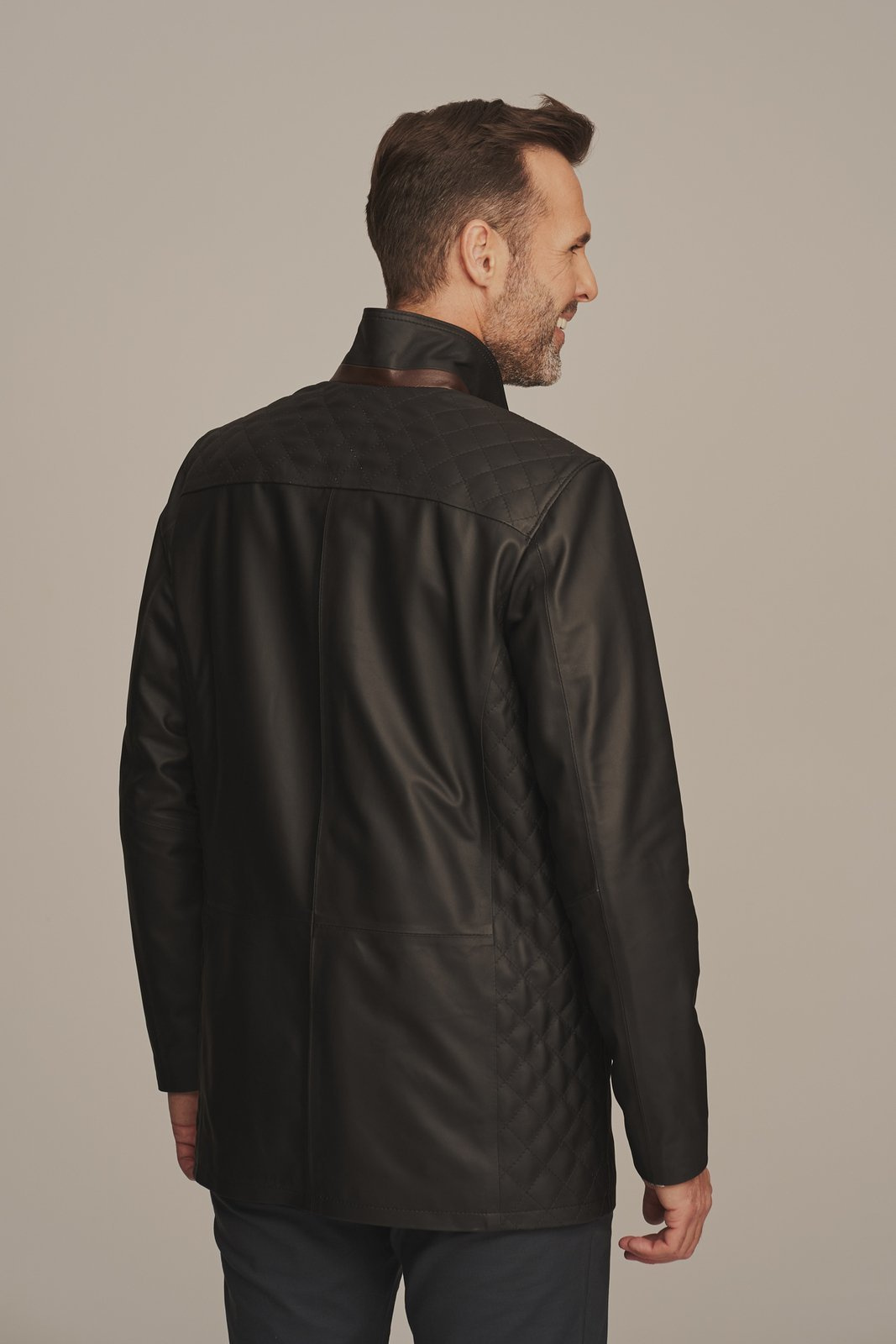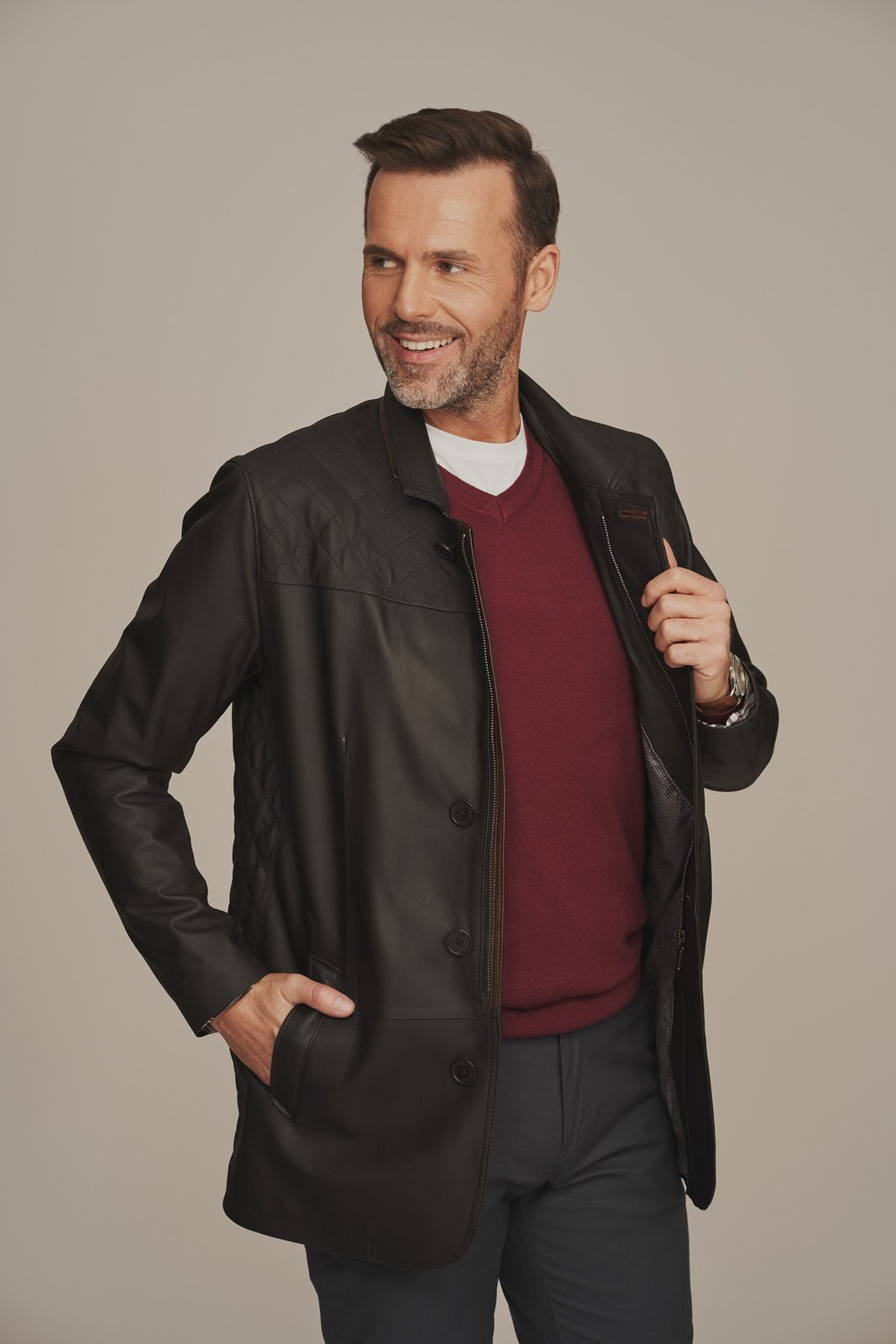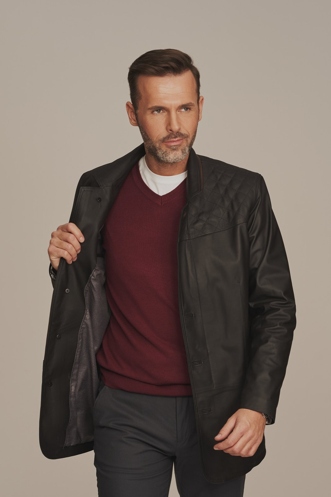 Vyriška odinė striukė iš natūralios avies odos, siūta iš itin švelnios ir minkštos avies odos, išsiskiria rafinuotu dizainu ir funkcionalumu. Tamsiai grafito spalva suteikia solidumo ir universalumo, puikiai derančio tiek prie kasdienių, tiek prie elegantiškų aprangos derinių. Ši ilgesnio kirpimo vyriška striukė siekia klubus ir gali puikiai pakeisti klasikinį švarką rudens ar pavasario sezonui. Modelį puošia subtilūs apsiuvimai pečių srityje bei kontrastinė detalė prie apykaklės – šviesiai rudos spalvos odos intarpas, suteikiantis papildomo stiliaus akcento. Striukė užsegama mygtukais, todėl išlaiko elegantišką siluetą ir minimalistinį įvaizdį. Dėl savo klasikinio tiesaus kirpimo ji puikiai prisitaiko prie įvairių figūrų ir išlieka patogi visos dienos metu. Ši vyriška ilga odinė striukė iš natūralios avies odos – tai pasirinkimas vyrui, vertinančiam kokybę, komfortą ir stilių. Ji puikiai tinka tiek verslo aplinkoje, tiek miesto stiliaus aprangai, išlieka aktuali ne vieną sezoną ir tampa pagrindiniu garderobo akcentu.