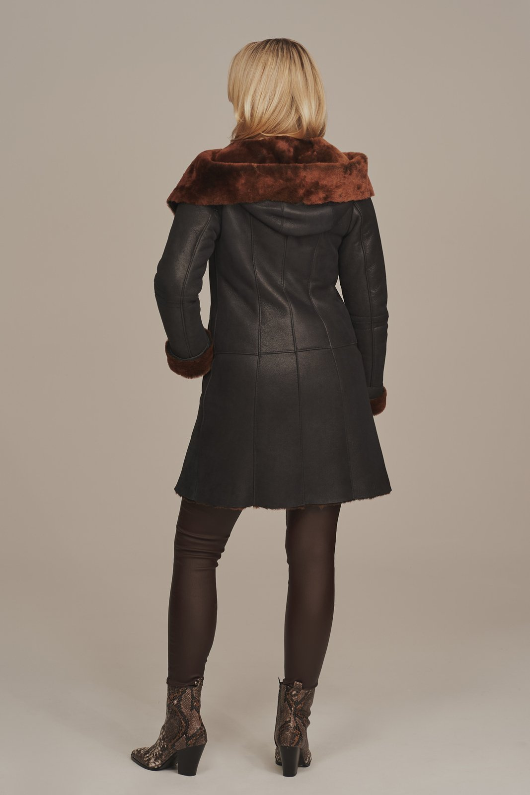 Moteriškas žieminis avikailio paltas su gobtuvu – grafito spalvos su auksiniu kailiu