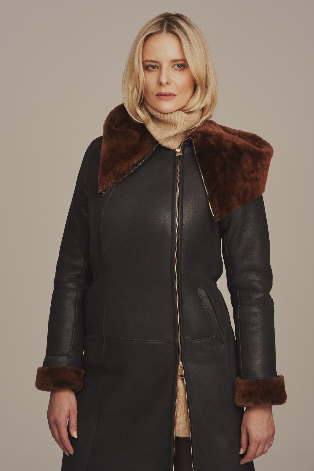 Moteriškas žieminis avikailio paltas su gobtuvu – grafito spalvos su auksiniu kailiu. Šis moteriškas žieminis avikailio paltas yra idealus pasirinkimas moterims, kurios ieško šilto, lengvo ir stilingo kailinio žiemai. Paltas pasiūtas iš natūralios avikailio odos, kuri pasižymi minkštumu, lengvumu ir puikiomis šilumos izoliacijos savybėmis, todėl apsaugo nuo šalčio net pačiomis vėsiomis dienomis. Paltas yra ilgis iki kelių, grafito spalvos su auksiniu kailiu, kuris suteikia prabangos ir išskirtinumo. Didelis, plačiai krentantis gobtuvas yra puoštas natūraliu kailiu, suteikdamas papildomą apsaugą nuo vėjo ir šalčio bei suteikdamas galimybę kurti įvairias stiliaus variacijas. Užsegamas šoniniu užtrauktuku, kuris suteikia modernumo ir praktiškumo. Modelis turi dvi įleistines kišenes, kurios praverčia ne tik praktiškai – jos taip pat puikiai dera prie elegantiško paltuko dizaino. Šis žieminis avikailio kailinis – puikus pasirinkimas kasdieniam nešiojimui mieste, taip pat ir išvykose, kai norisi ne tik šilumos, bet ir stiliaus..