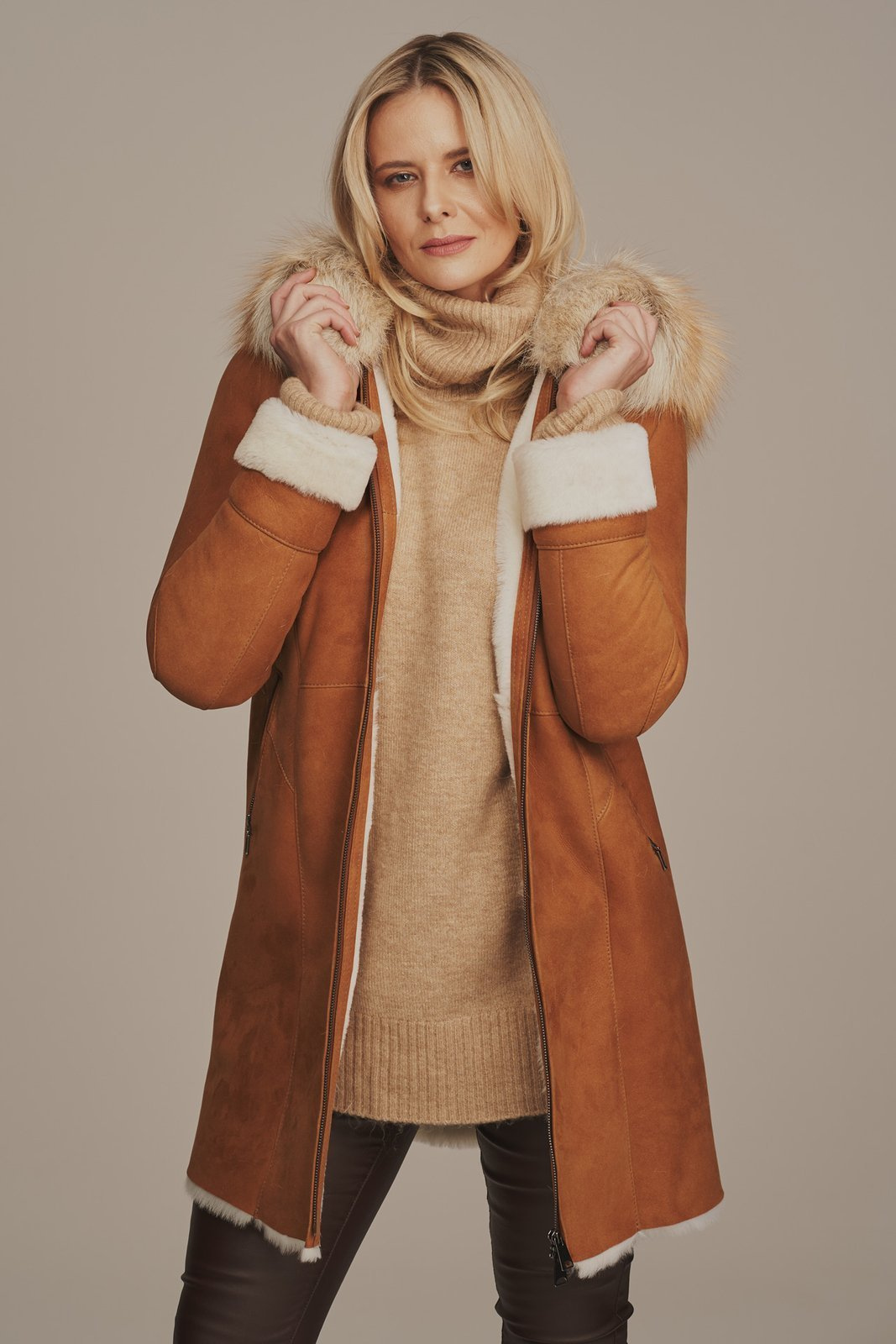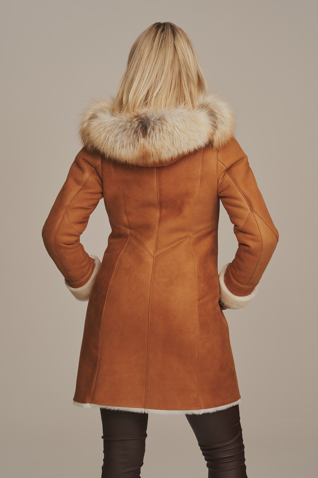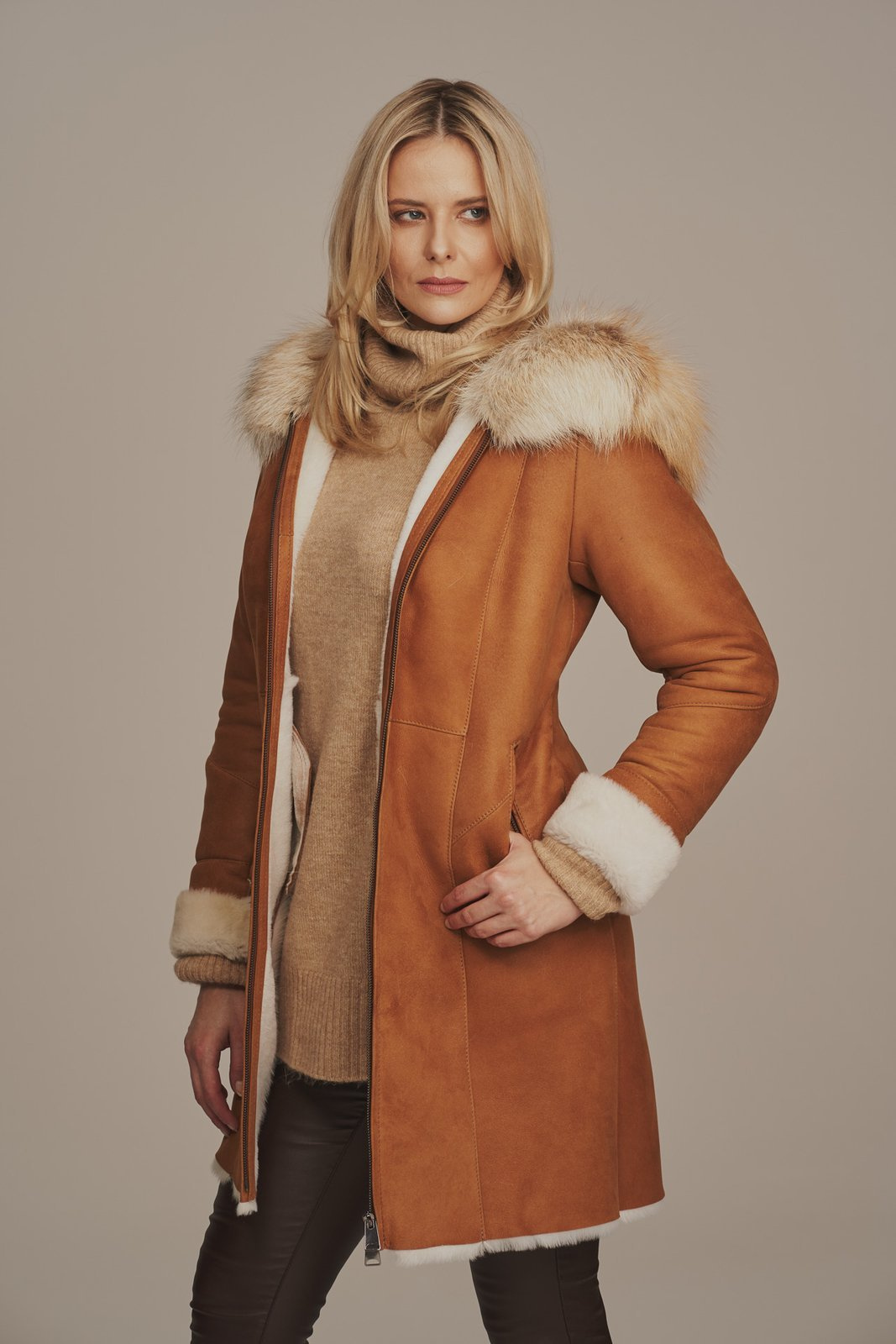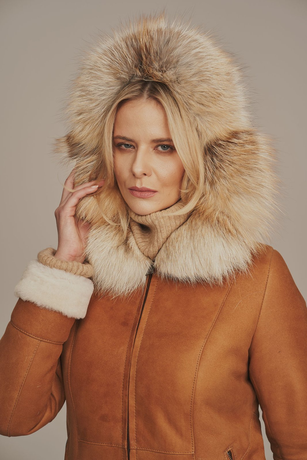 Žieminis moteriškas avikailio paltas su gobtuvu ir lapės kailio apdaila. Šis žieminis moteriškas avikailio paltas su gobtuvu ir lapės kailio apdaila – puikus pasirinkimas toms, kurios ieško šilto, stilingo ir kokybiško drabužio šaltoms dienoms. Paltas pasiūtas iš natūralios avikailio odos, kuri yra itin lengva, švelni ir puikiai sulaiko šilumą. Raiški rusva spalva su baltu kailiu suteikia elegancijos ir išskirtinumo. Platus gobtuvas, puoštas natūraliu lapės kailiu, ne tik atrodo prabangiai, bet ir puikiai apsaugo nuo vėjo bei šalčio. Ilgis iki kelių ir dvi patogios kišenės daro šį avikailio kailinį praktišku pasirinkimu kasdienai. Šis natūralaus avikailio kailinis moterims su lapės kailio gobtuvu – puikus sprendimas žiemos sezonui, kai norisi derinti stilių su funkcionalumu. Tai ne tik gražus, bet ir šiltas moteriškas kailinis žiemai, tinkantis tiek mieste, tiek kelionėse.
