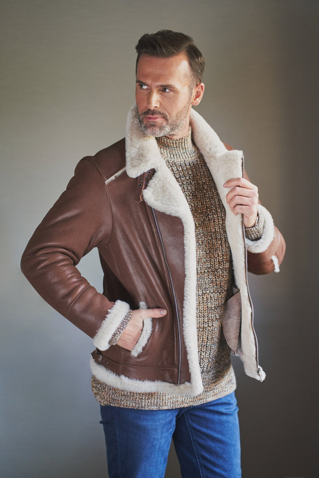 Vyriška aviatoriaus stiliaus striukė iš natūralios avikailio odos – šviesiai ruda spalva su baltu kailiu. Vyriška aviatoriaus stiliaus striukė iš natūralios avikailio odos – tai puikus pasirinkimas vyrams, ieškantiems šilto, lengvo ir stilingo drabužio kasdieniam nešiojimui žiemą. Ši aviatoriaus tipo striukė iki klubų sukurta pagal klasikinį „pilotų“ modelį, derinant funkcionalumą ir išskirtinį dizainą. Pagaminta iš aukštos kokybės natūralios, lengvos avikailio odos, ši striukė užtikrina šilumą net ir šalčiausiomis dienomis. Dvi įleistinės kišenės suteikia praktiškumo, o atverčiamas arba pastatomas apykaklės dizainas leidžia prisitaikyti prie oro sąlygų – puiki alternatyva šalikui. Unikalios siūlės su matomu kailiu suteikia išskirtinį charakterį ir pabrėžia natūralių medžiagų grožį. Tai ne tik stilinga, bet ir ilgaamžė vyriška striukė iš avikailio, tinkanti tiek kasdienai, tiek savaitgalio išvykoms.