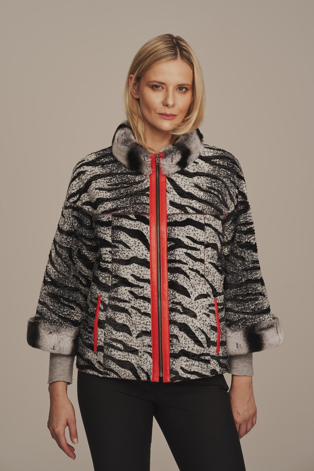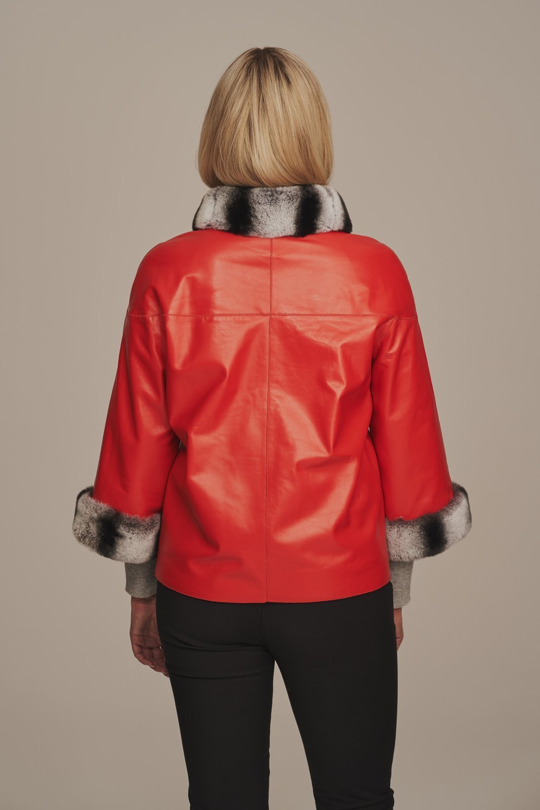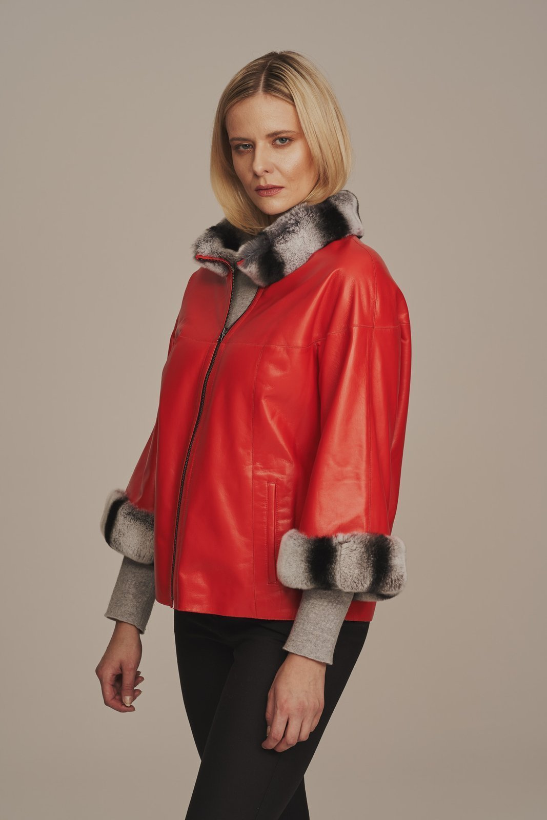 Moteriška pašiltinta natūralios odos striukė – dvipusė, koralų spalvos, su castorex kailiu. Moteriška natūralios avikailio odos striukė, pašiltinta ir dvipusė, pasiūta iš itin minkštos, elastingos avies odos, natūralaus koralų atspalvio. Modelis ilgio iki klubų, tinkamas dėvėti rudens ir žiemos sezonu. Viena pusė – lygios faktūros oda, kita – aukštos kokybės švelnus audinys, malonus liesti. Striukė turi keturias įleistines kišenes – po dvi kiekvienoje pusėje. Rankovės bei aukšta apykaklė (stovė) yra dekoruotos natūraliu castorex kailiu, kuris suteikia šilumos ir pabrėžia klasikinį modelio charakterį. Užsegama metaliniu užtrauktuku. Dvipusė odinė striukė moterims užtikrina funkcionalumą ir stilių viename gaminyje. Konstrukcija leidžia dėvėti abi puses, keičiant bendrą išvaizdą be papildomų detalių. Pašiltinta moteriška odinė striukė iš natūralios odos tinka kasdieniam dėvėjimui mieste, taip pat ir kaip dalis elegantiško aprangos derinio. Moteriška striukė su natūraliu kailiu užtikrina komfortą žemesnėje temperatūroje ir išlieka ilgaamžė net intensyviai dėvint.
