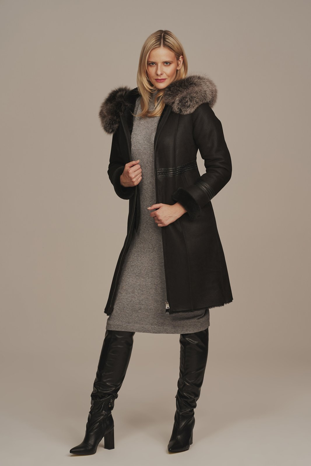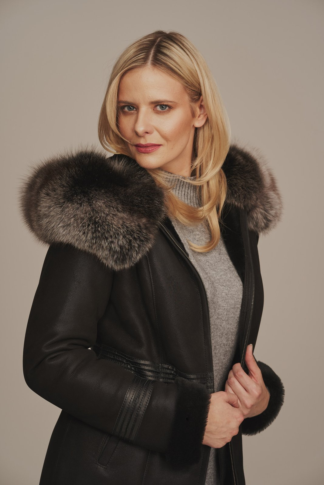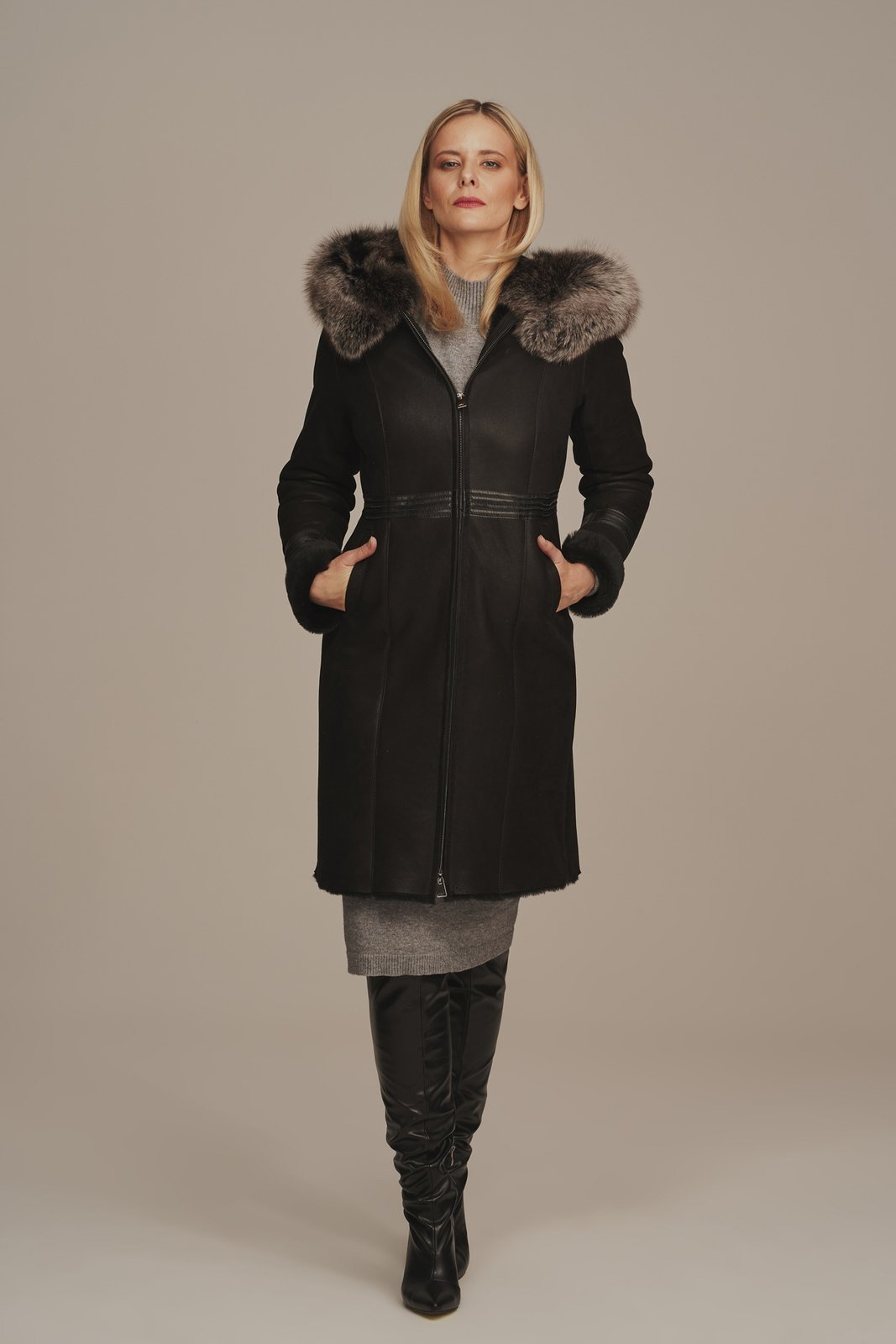 Tikri natūralios avikailio odos kailiniai su gobtuvu ir natūraliu lapių kailiu – juodi, iki kelių. Šie tikri avikailio kailiniai moterims yra puikus pasirinkimas žiemai – pagaminti iš aukštos kokybės, natūralios avikailio odos, pasižyminčios švelnumu, lengvumu ir šiluma. Tai tikras moteriškas kailinis, kuris suteiks komforto net šalčiausiomis dienomis. Kailiniai turi talioje šiek tiek siaurėjantį siluetą, todėl puikiai pabrėžia figūrą. Juodos spalvos modelis yra praktiškas ir elegantiškas, o gobtuvas, apjuostas prabangiu natūraliu lapių kailiu su švelniai pašviesintais galiukais, suteikia papildomos šilumos ir stilingumo. Šie tikros odos kailiniai su lapių kailiu pasižymi reguliuojamomis rankovėmis, kurios leidžia pritaikyti kailinių ilgį pagal poreikį. Dekoratyvinės siūlės iš lygaus odos audinio ties liemeniu ir rankovėmis suteikia kailiniams originalumo ir išskirtinumo. Kailinių ilgis – iki kelių, todėl jie puikiai tinka šaltoms ir vėjuotoms žiemos dienoms, užtikrindami komfortą ir apsaugą nuo šalčio.