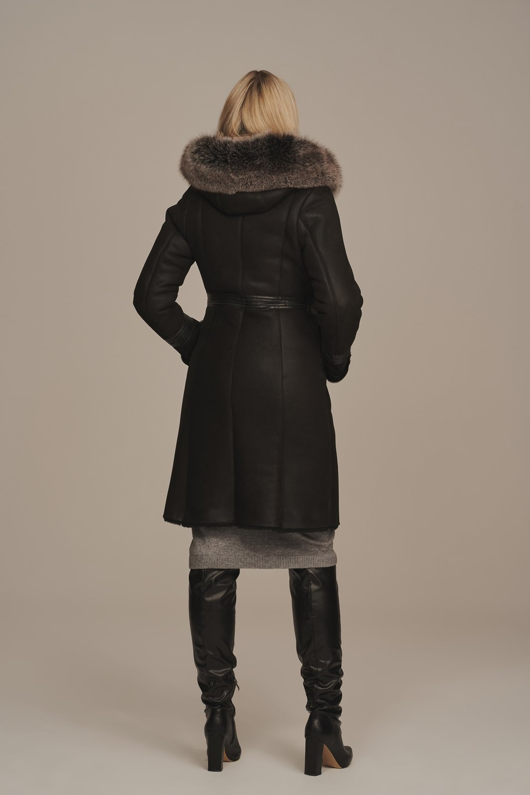 Tikri natūralios avikailio odos kailiniai su gobtuvu ir natūraliu lapių kailiu – juodi, iki kelių