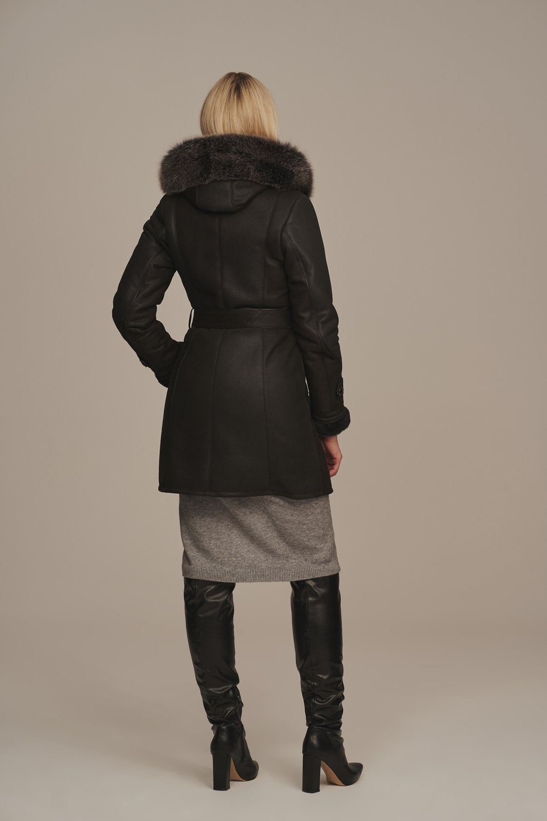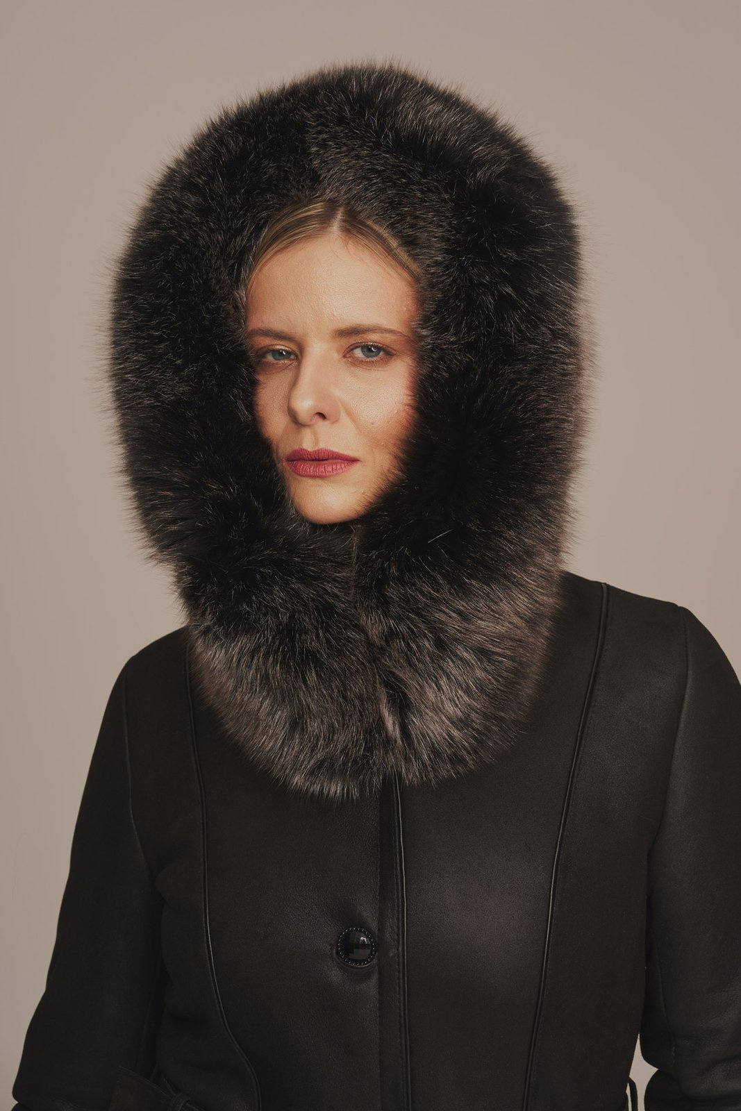 Tikros odos moteriški kailiniai su gobtuvu ir lapių kailiu – juodi, avikailio, iki klubų