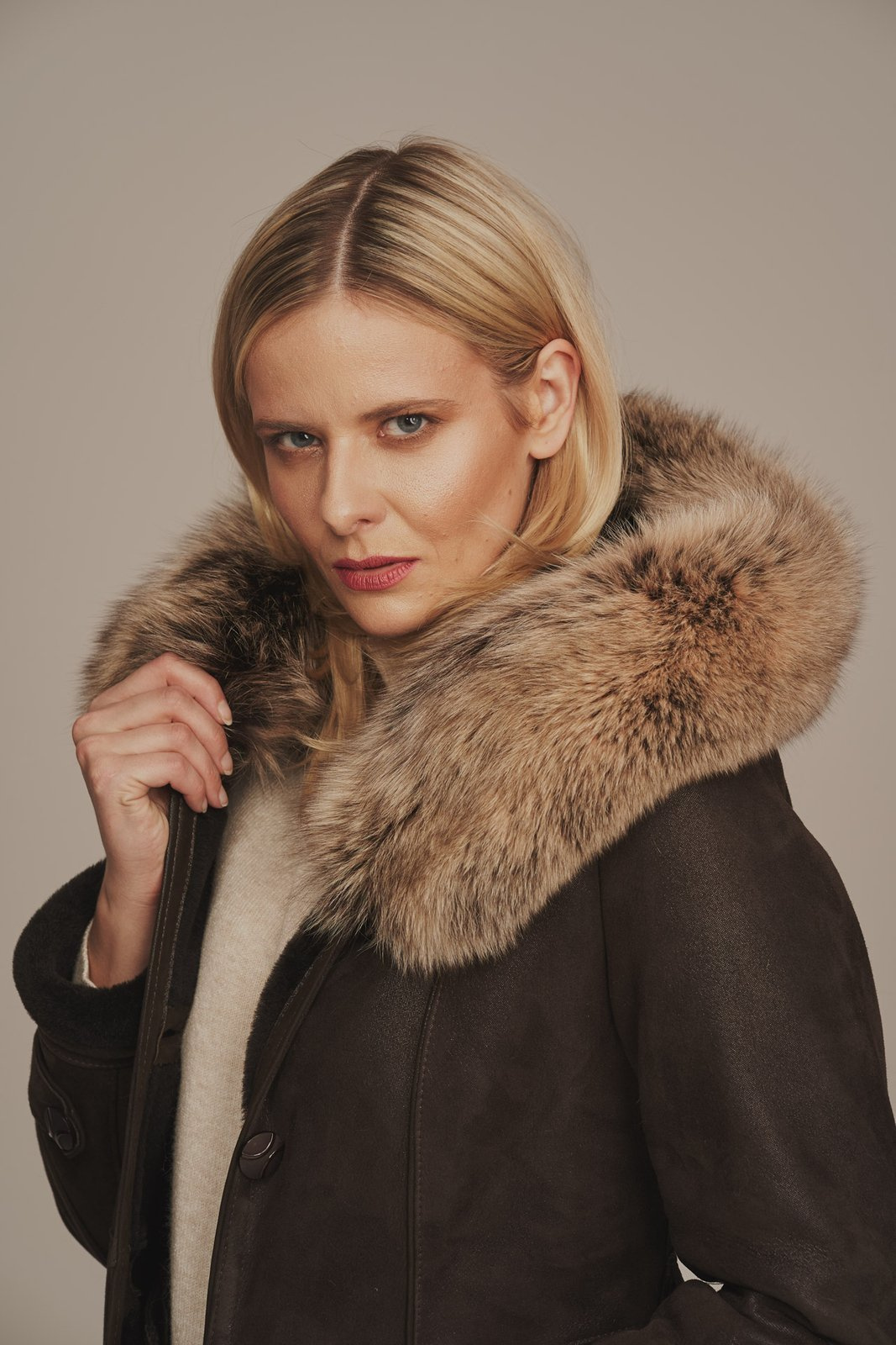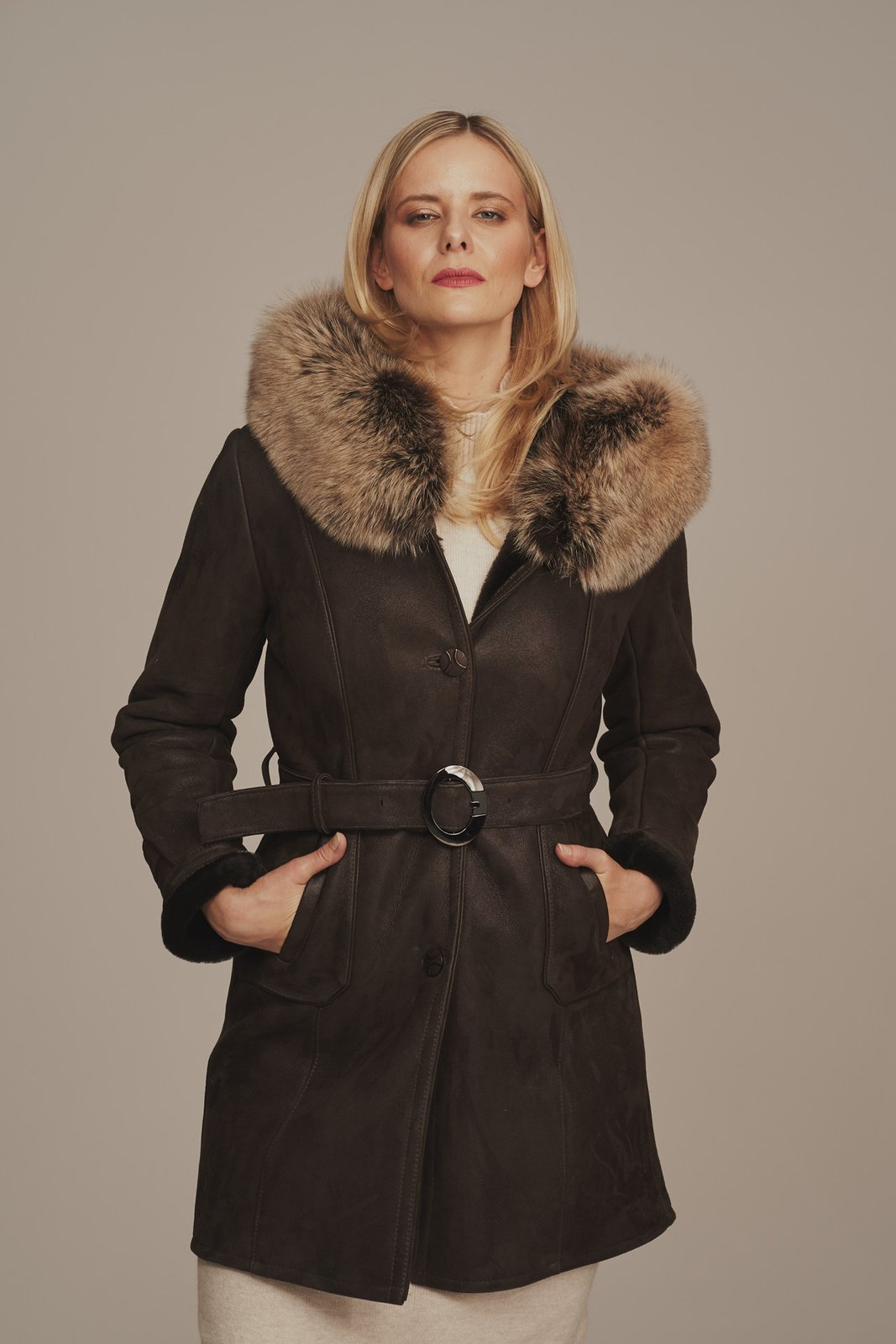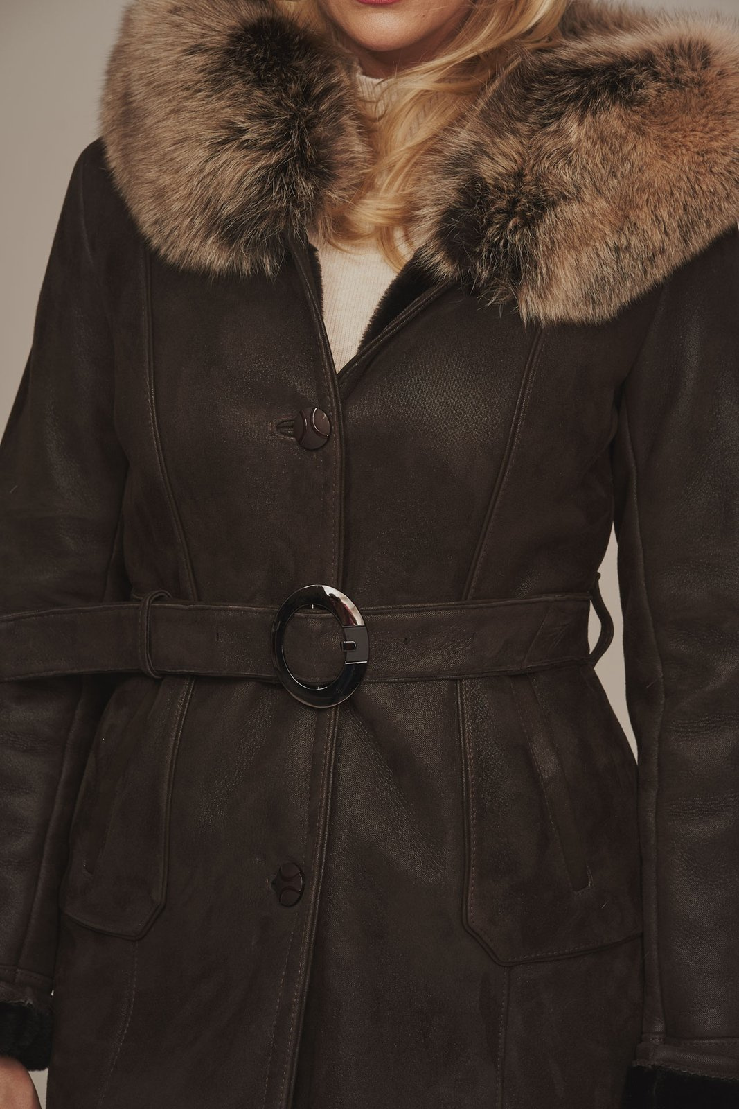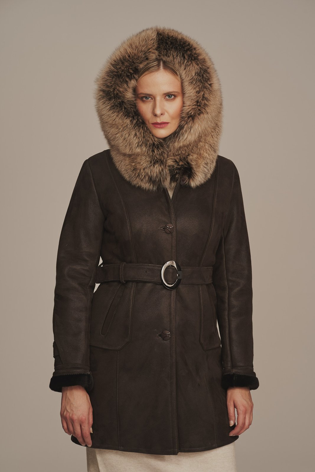 Tikros odos moteriški kailiniai su gobtuvu – rudas avikailio paltas su natūraliu lapių kailiu. Stilingas moteriškas žieminis paltas, pagamintas iš tikros avikailio odos su natūraliu kailiu. Šie verstos odos kailiniai yra lengvi, minkšti ir šilti – puikiai pritaikyti šaltajam metų laikui. Modelis rudos spalvos, užsegamas asimetrišku užtrauktuku, su dviem įleistinėmis kišenėmis ir rankovėmis, kurių ilgį galima šiek tiek reguliuoti. Platus gobtuvas dekoruotas natūraliu lapių kailiu, kuris suteikia išskirtinumo ir papildomos šilumos. Lapių kailis puikiai dera su avikailio oda, išlaikant prabangų ir šiuolaikišką įvaizdį. Šis moteriškas avikailio paltas puikiai tinka tiek kasdienai, tiek išskirtinėms progoms. Kokybiški tikros odos kailiniai moterims – tai ilgaamžiškas ir stilingas sprendimas žiemai, kai svarbiausia – natūralumas, šiluma ir patogumas.
