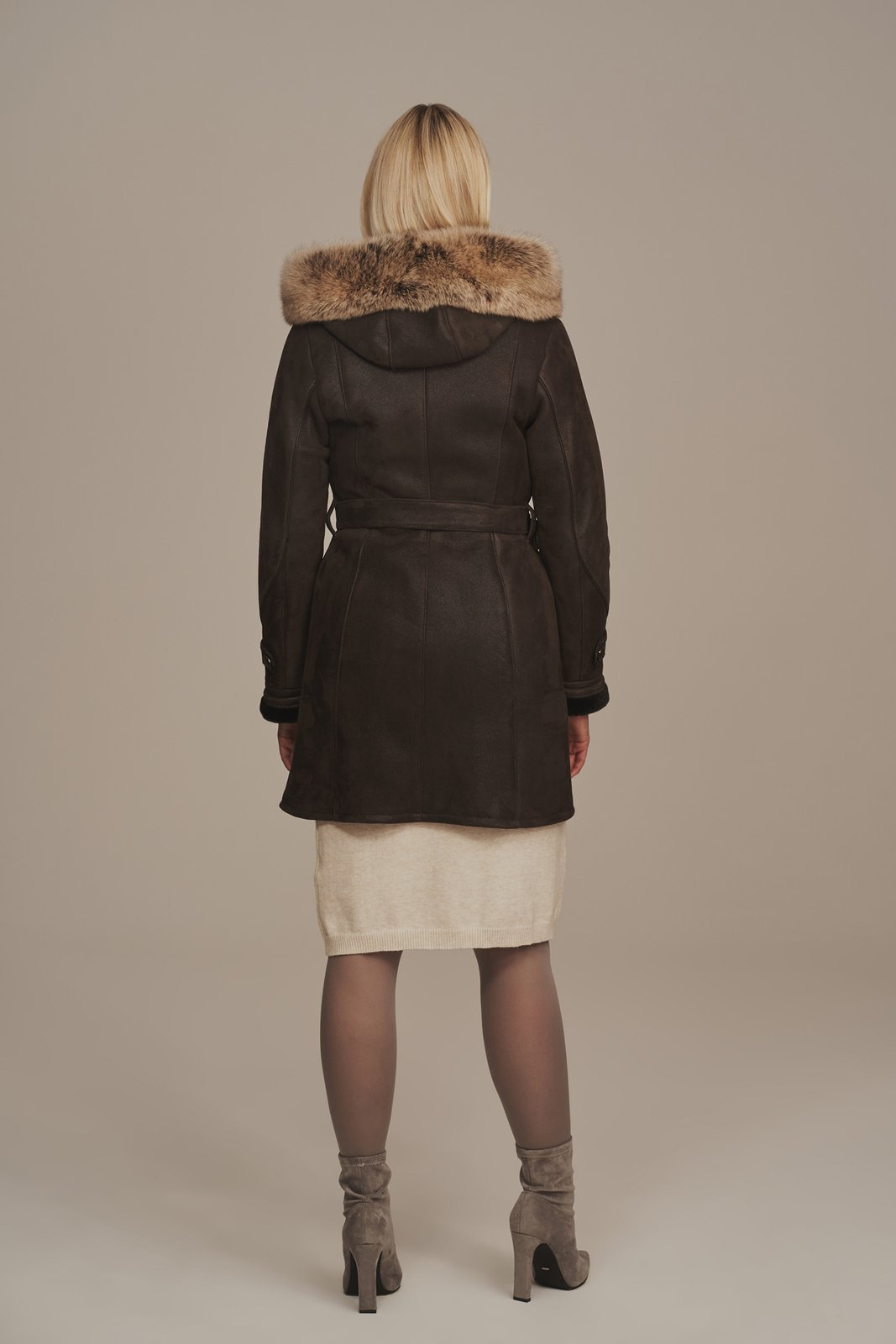 Tikros odos moteriški kailiniai su gobtuvu – rudas avikailio paltas žiemai